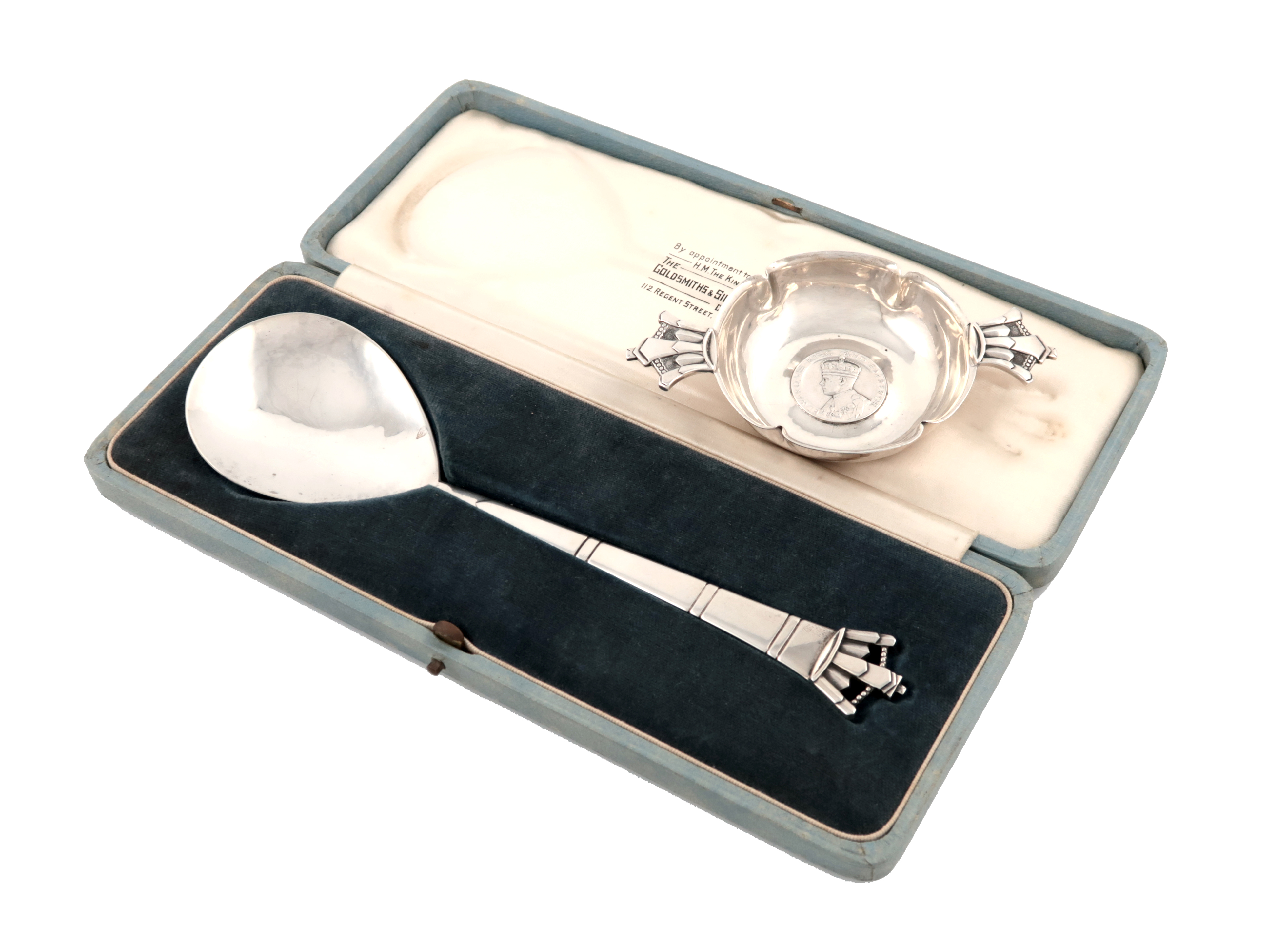 lobed circular form, with crown handles, the centre set with an Edward VIII coronation medallion, plus a cased silver spoon by the same maker, with a crown finial, inscribed, approx. total weight 4.9oz. (2)