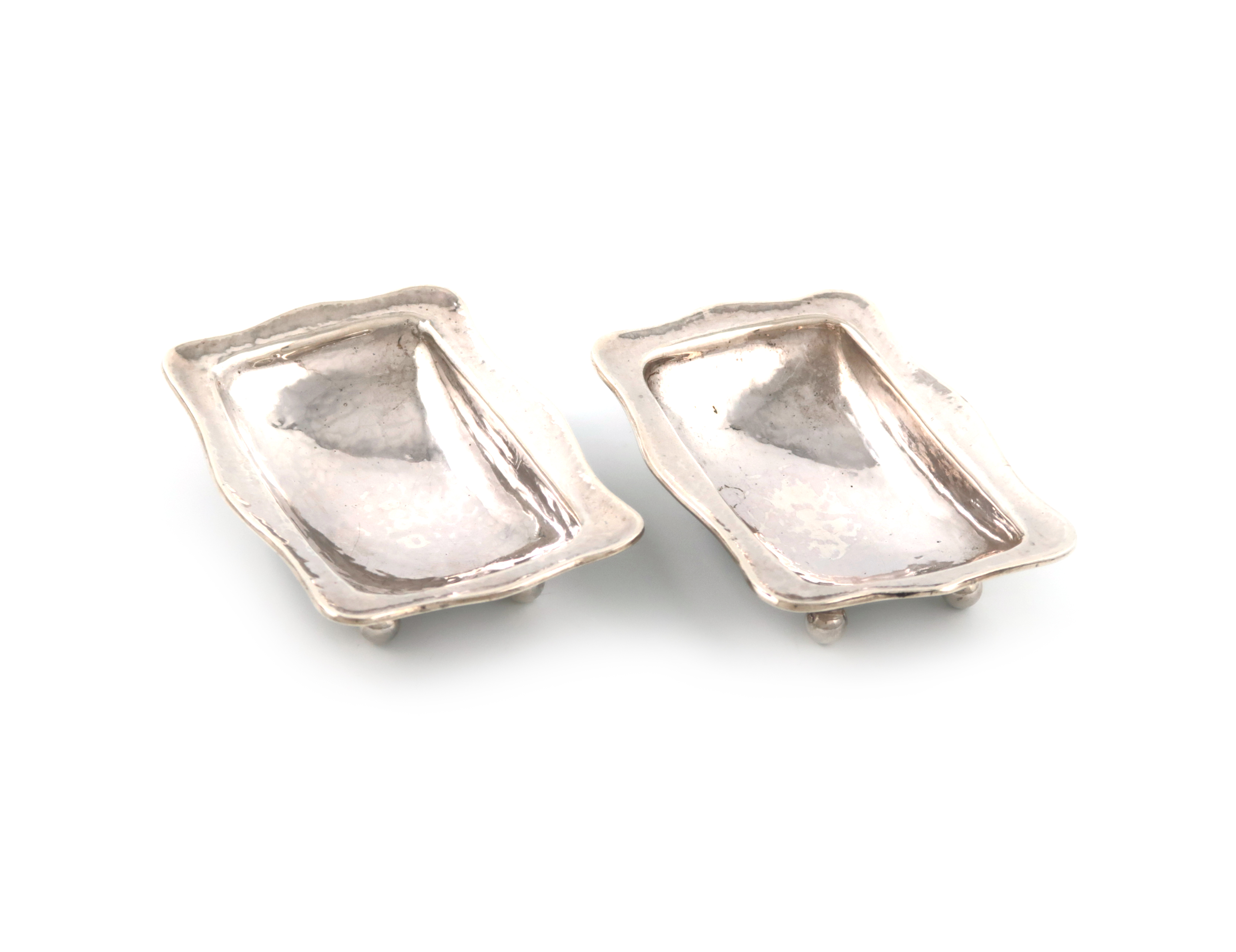 shaped rectangular form, spot-hammered decoration, on four ball feet, length 7.8cm, approx. weight 1.6oz. (2)
