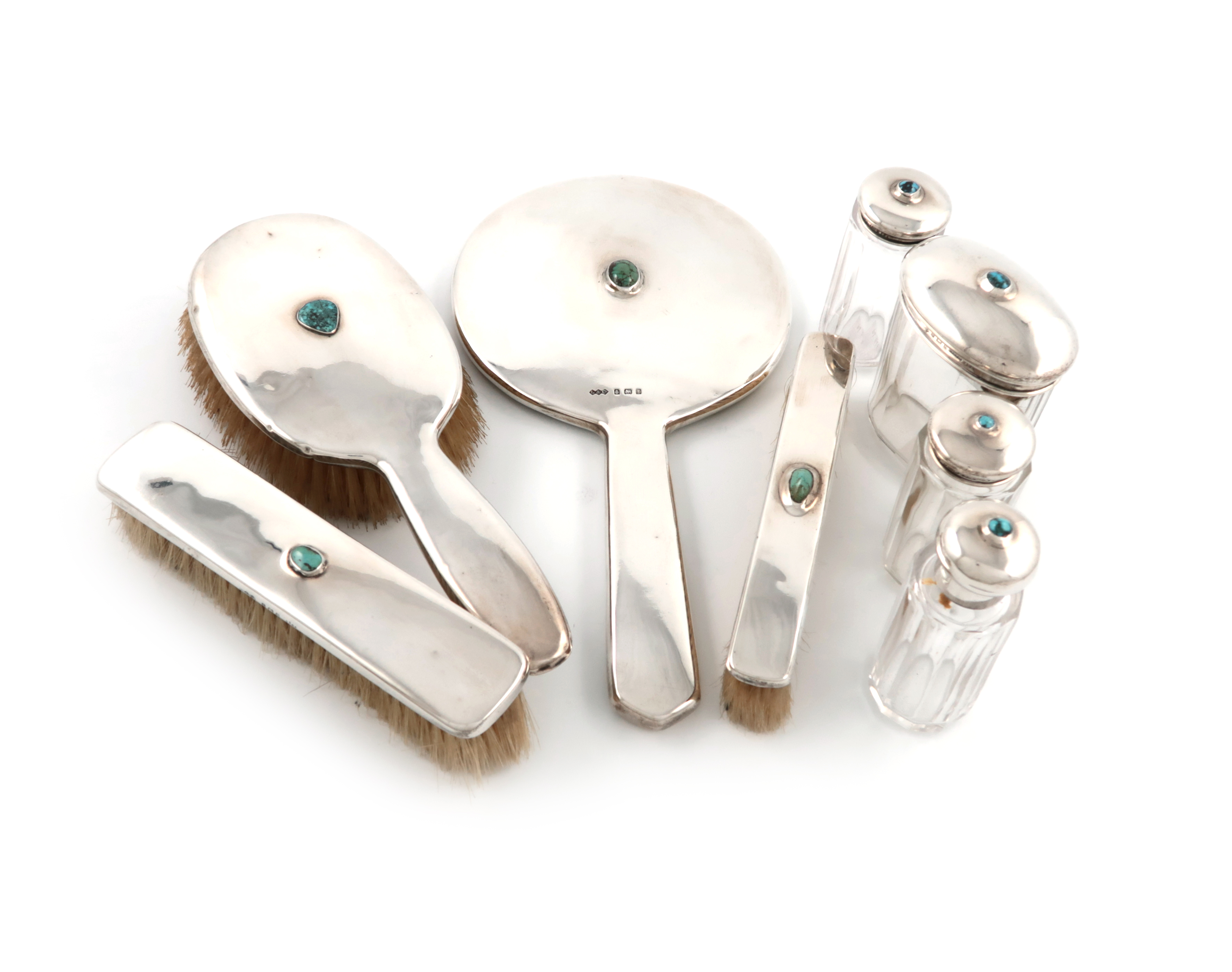 the reverse set with a turquoise cabochon, comprising: a hand mirror, a hair brush, two clothes brushes, and four silver-mounted glass toilet jars. (8)