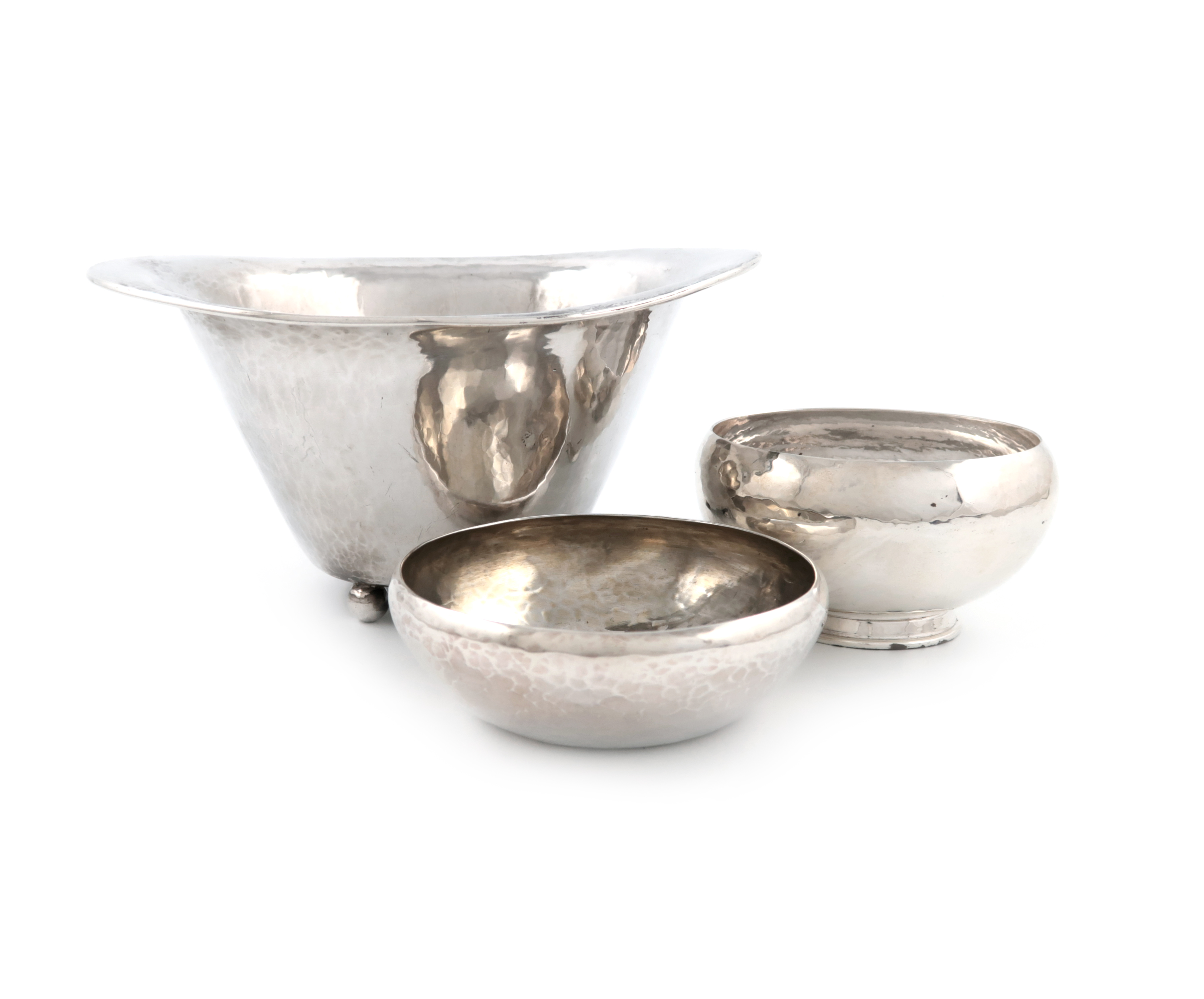 tapering oval form, in the Georg Jensen manner, spot-hammered decoration, initialled, plus a small American silver bowl, by Randahl, Chicago, and a circular spot-hammered bowl, signed 'P.H.M', gilded bowl, approx. weight 16oz. (3)
