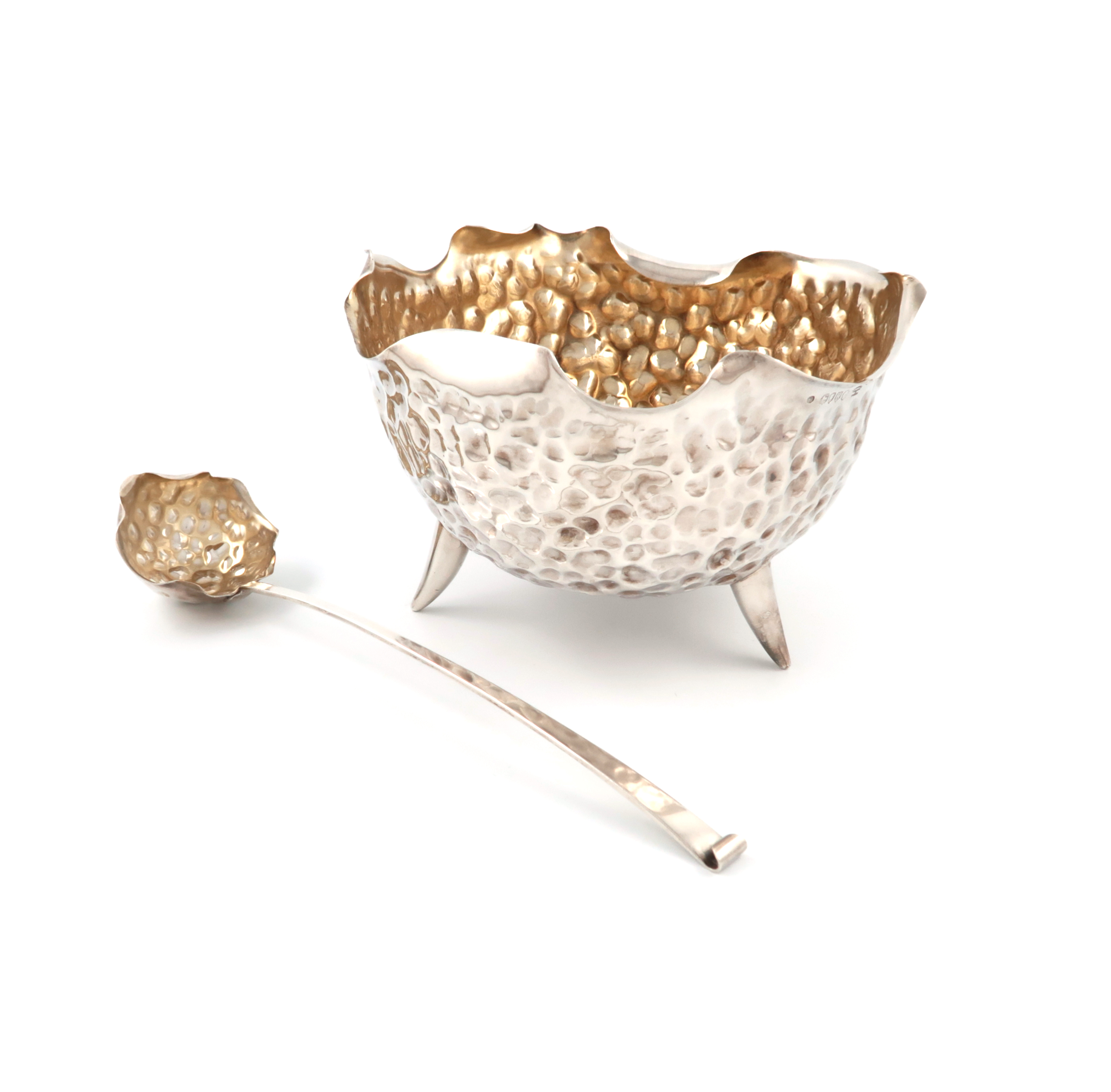circular form, large spot hammered decoration, wavy-edge border, on three slender tapering feet, diameter 22.4cm, approx. weight 26.6oz. (2)