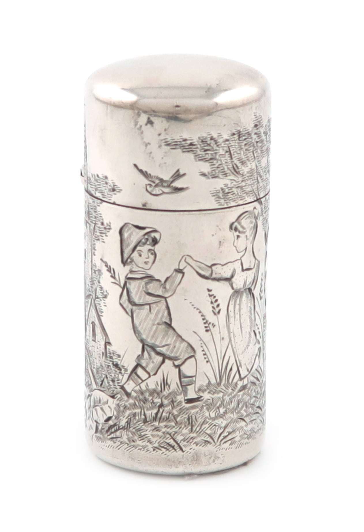 cylindrical form, with engraved Kate Greenaway decoration of three dancing children with a country church behind, hinged cover, height 5.7cm.