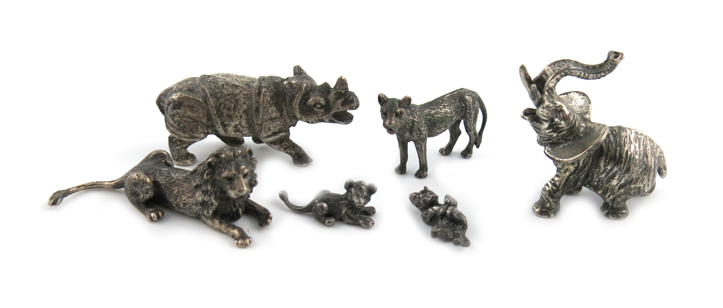 comprising an elephant, a rhino, a lion, lioness and two cubs, approx weight 2.4oz. (6)
