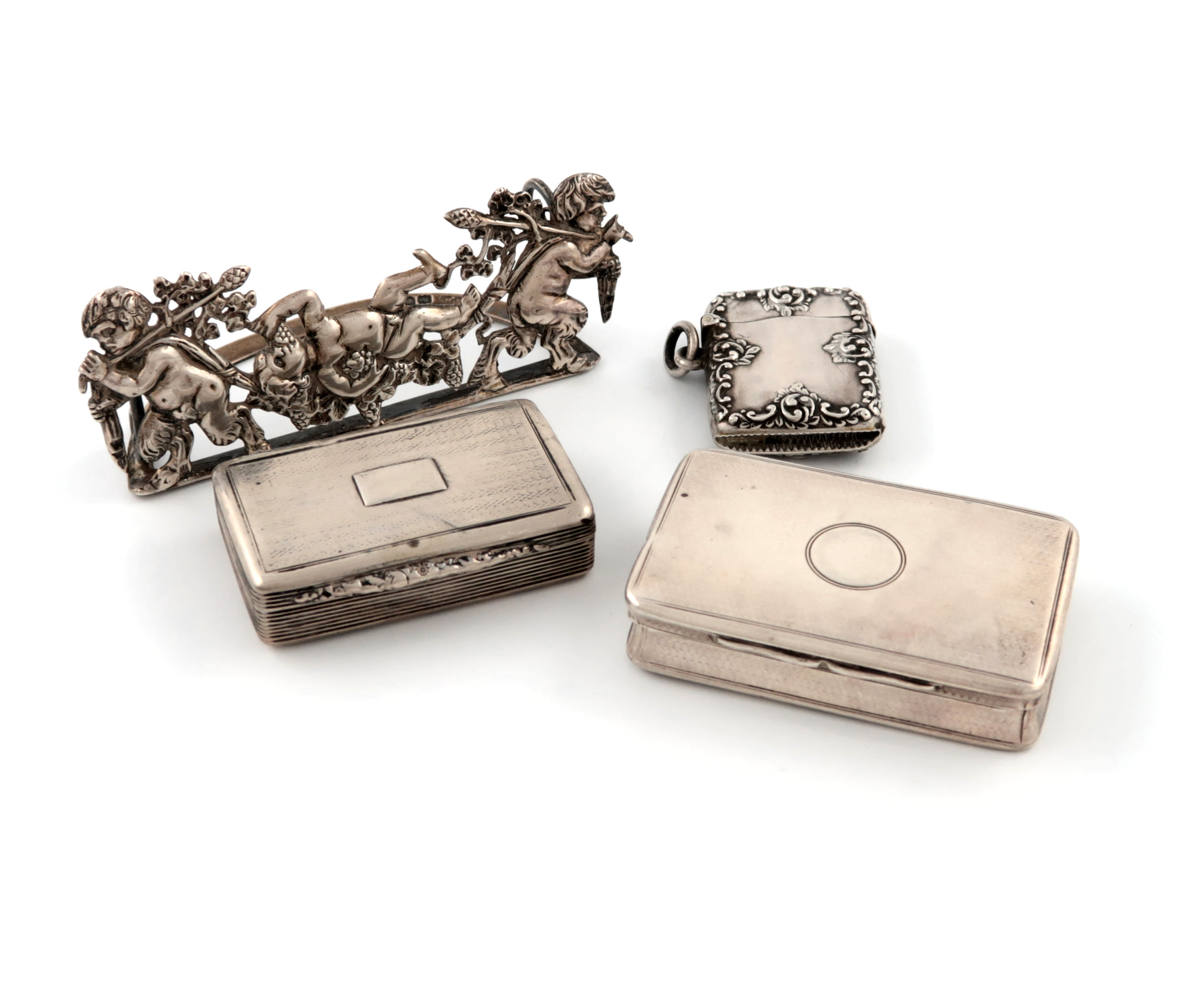 comprising: a William IV silver snuff box, Birmingham 1832, engine-turned decoration, a Victorian snuff box, Birmingham 1850, a vesta case, and a menu card holder pierced with cherubs, London 1902, approx. weight 5.5oz. (4)