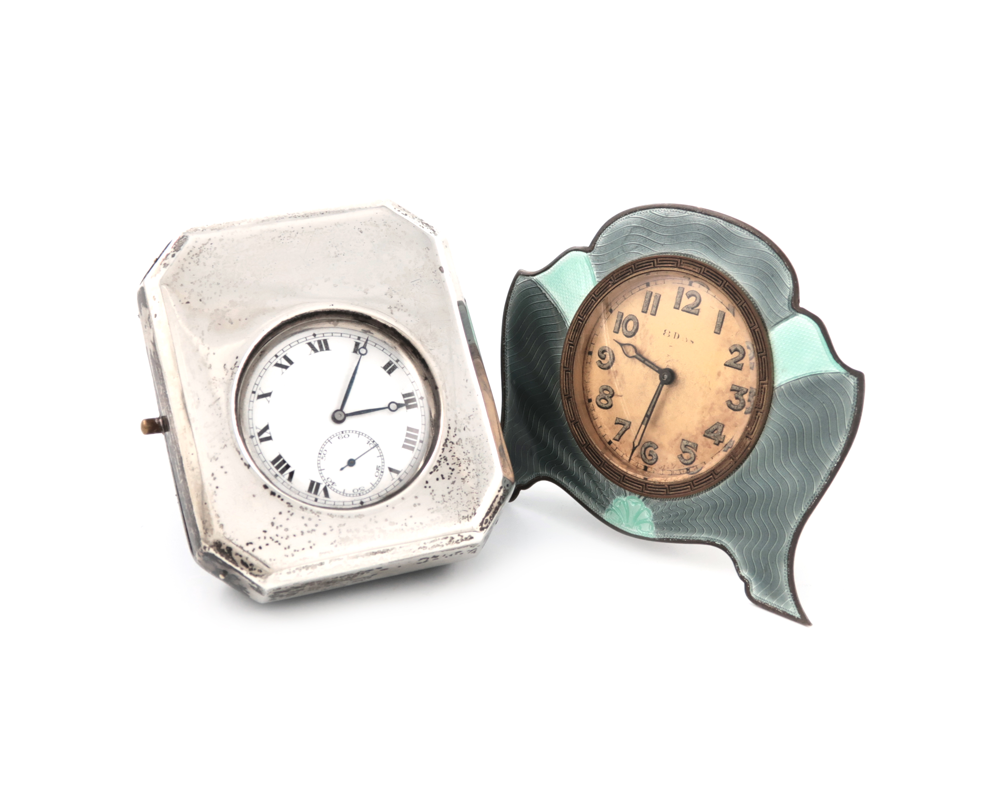 arched rectangular form, gilt-metal back and easel strut, length 9.7cm, plus a silver travelling watch case and pocket watch, the case London 1919, inscribed. (2)