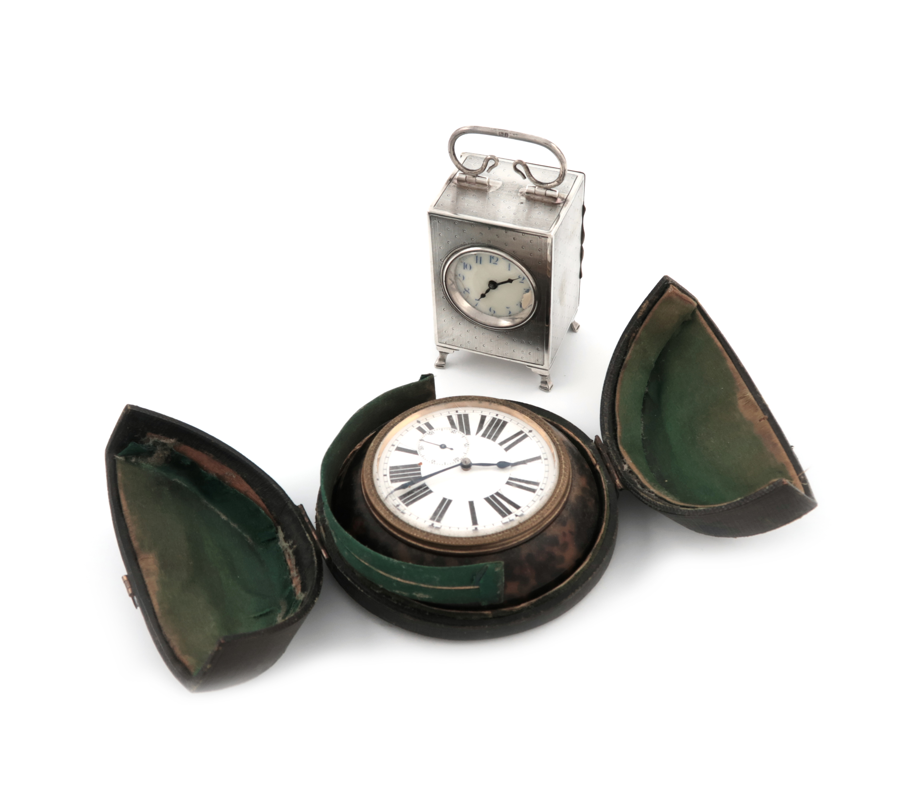 upright rectangular form, engine-turned and dot decoration, hinged carrying handle, on four bracket feet, height 7cm, plus a gilt-metal and tortoiseshell desk clock, a.f, in a fitted case. (2)
