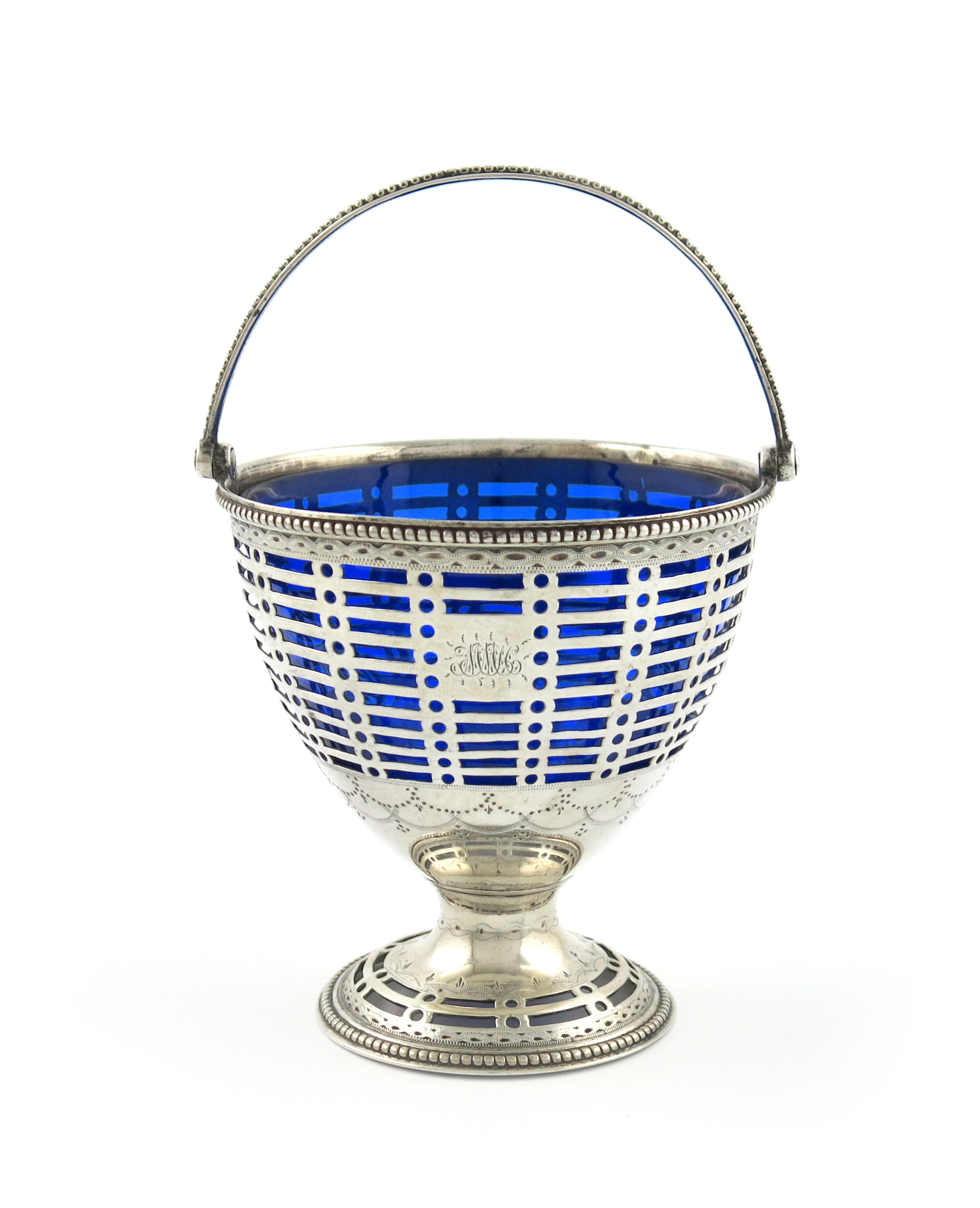 vase form, pierced with horizontal slats, beaded borders and swing-handle, with a blue glass liner, height 9cm, approx. weight 3.6oz.