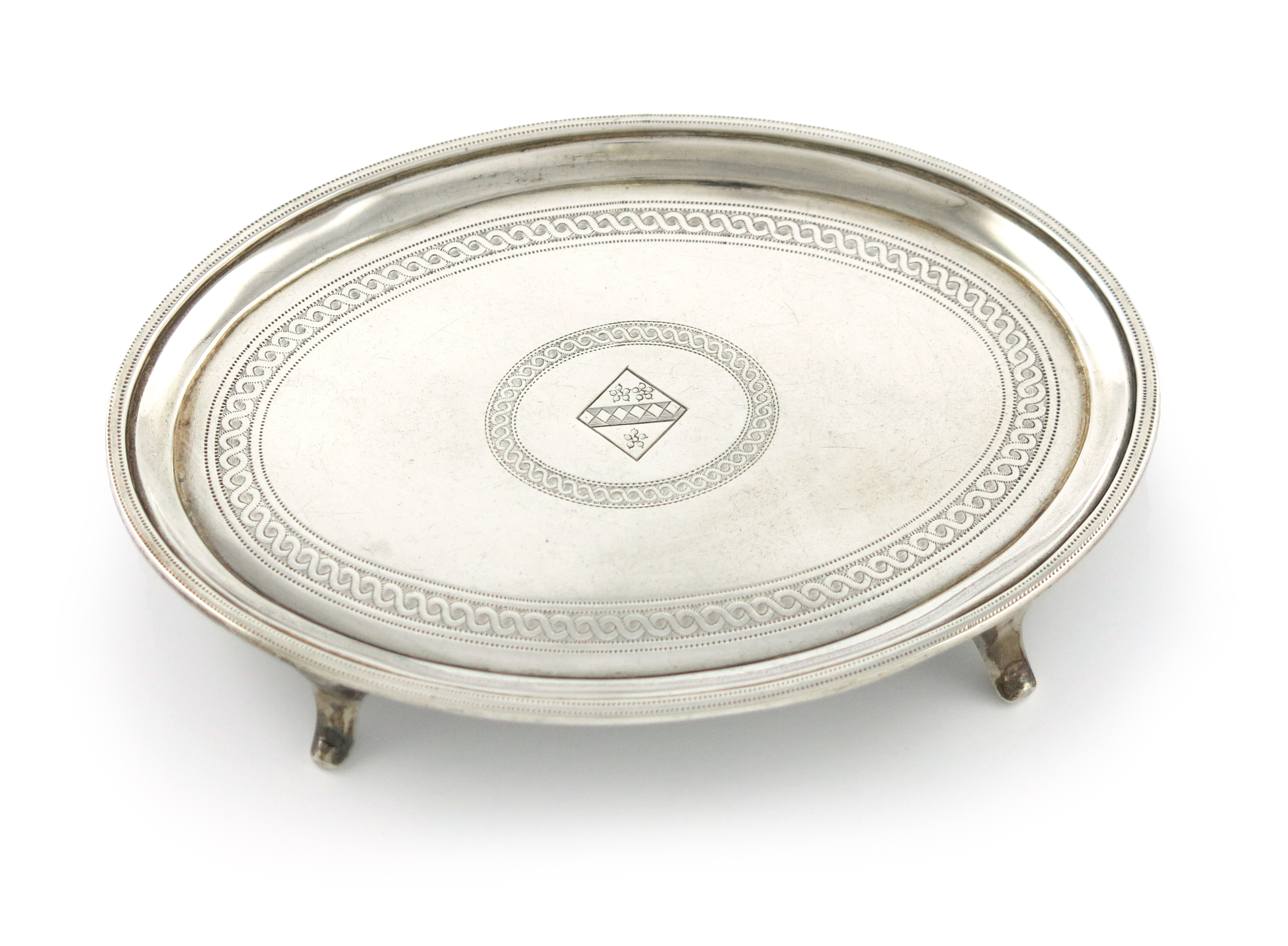 oval form, bright-cut decoration, with a crest, on four bracket feet, length 16.3cm, approx. weight 4oz.