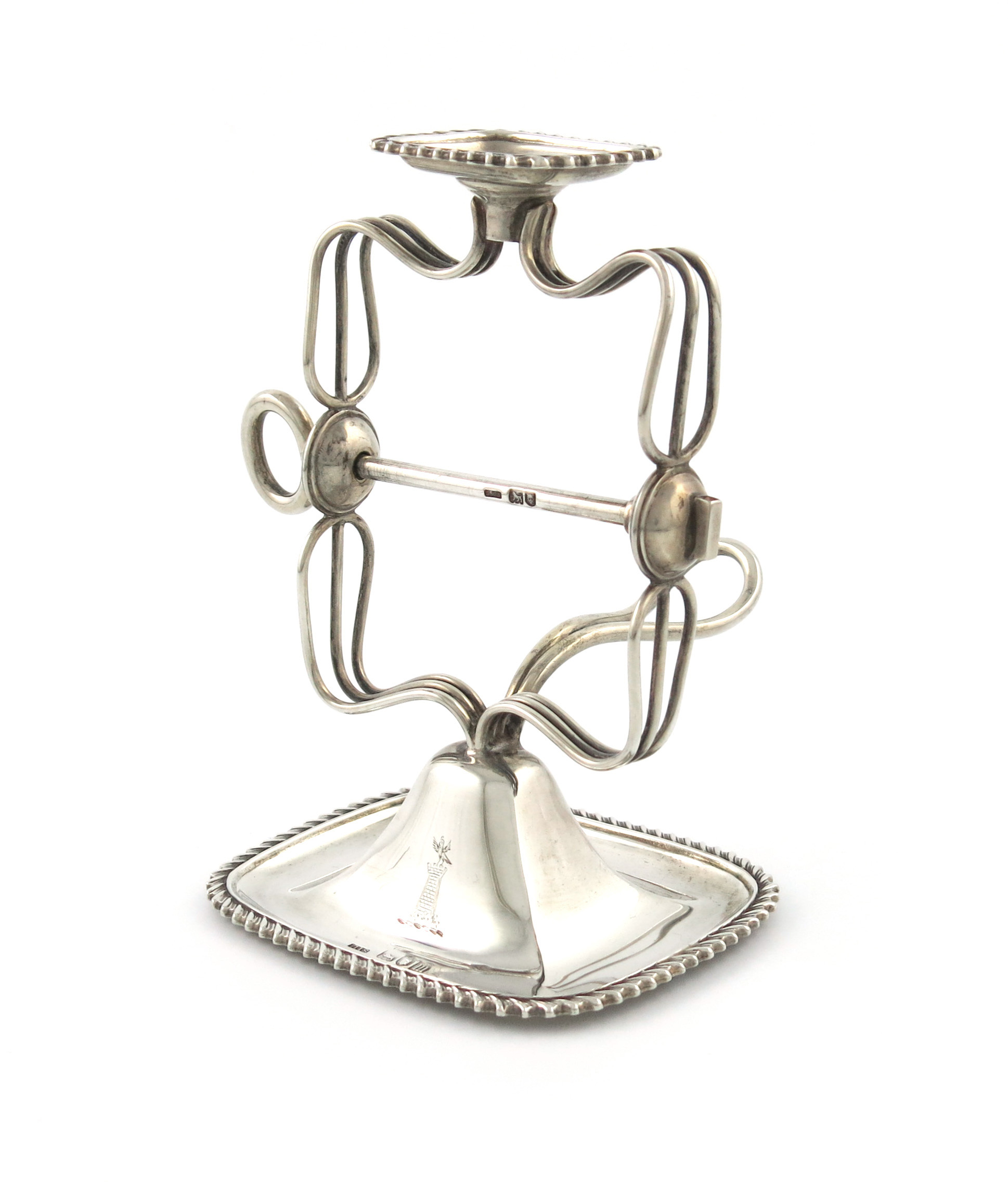 on a raised rectangular base with a gadroon border, wire-work frame and handle, engraved with a crest, height 13cm, approx. weight 4.4oz.