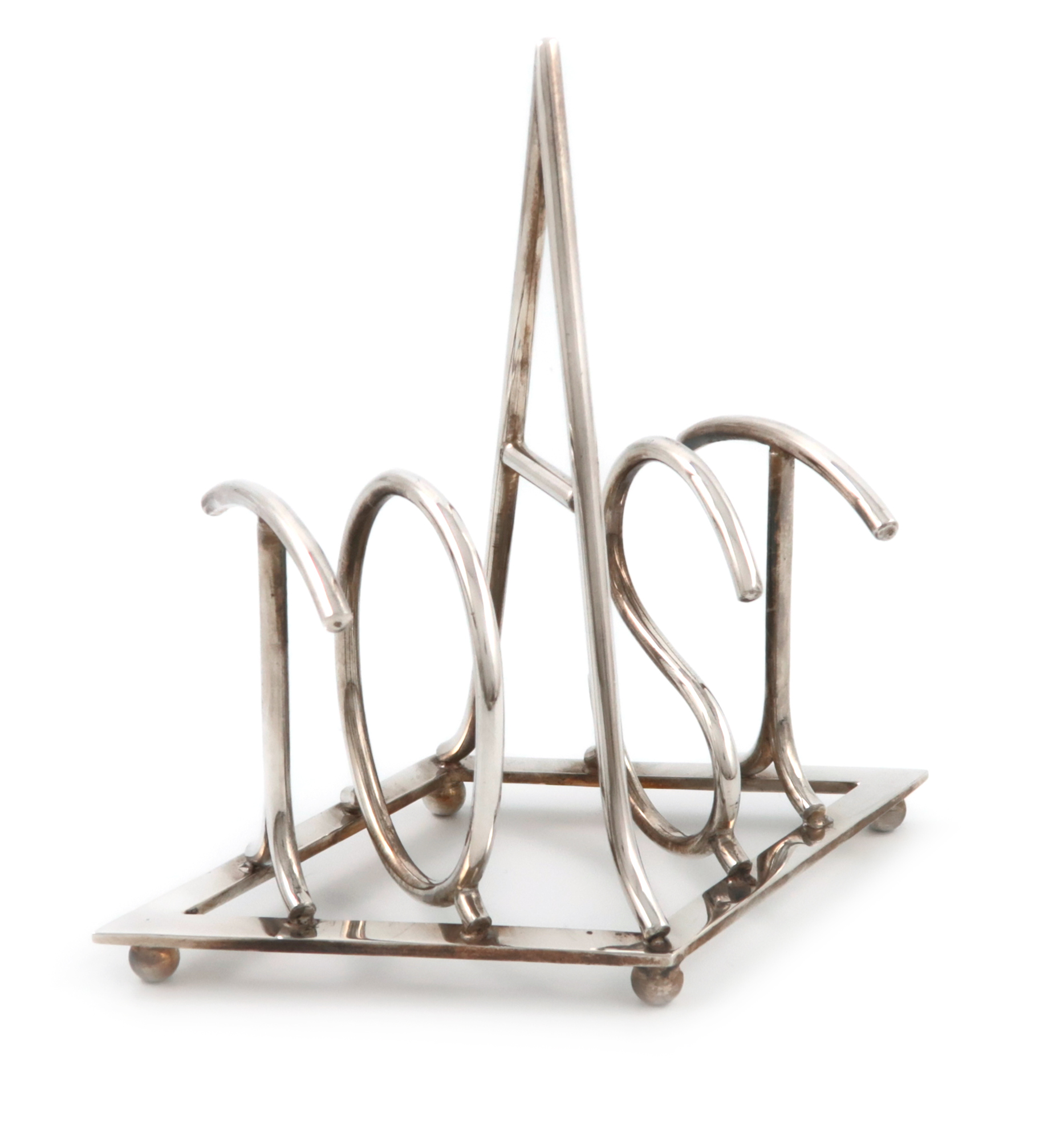 the bars modelled as the letters of 'TOAST', on a lozenge base on four ball feet, length 17.5cm, approx. weight 10.5oz.