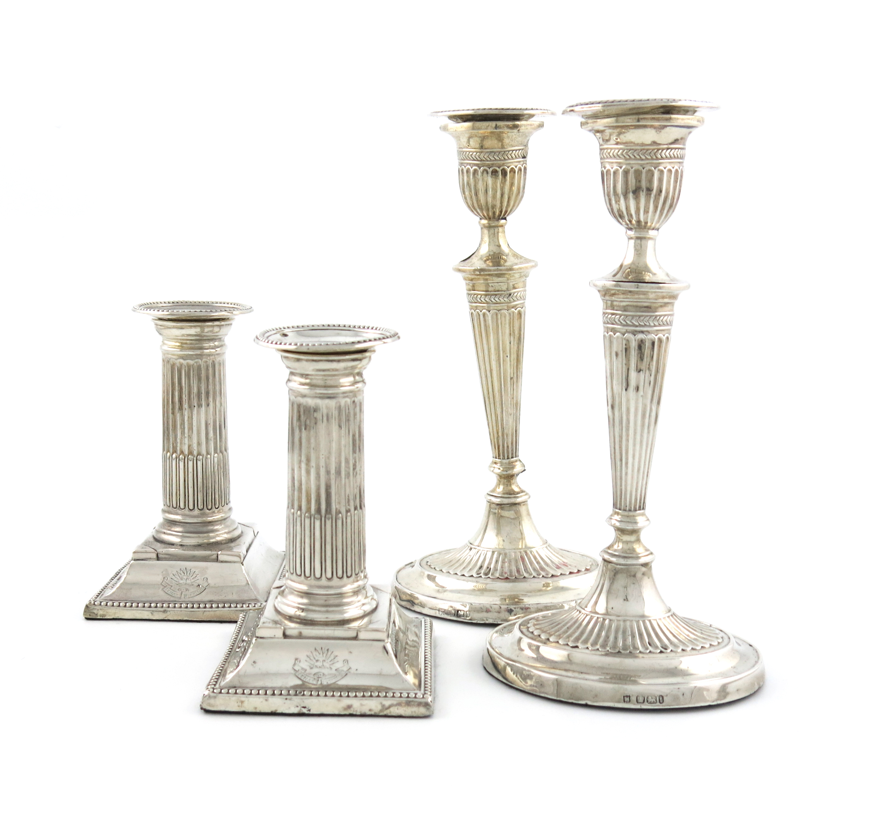 tapering oval form, part-fluted decoration, on raised oval bases, plus a pair of Victorian silver candlesticks, marks worn, fluted columns, on raised square bases. (4)