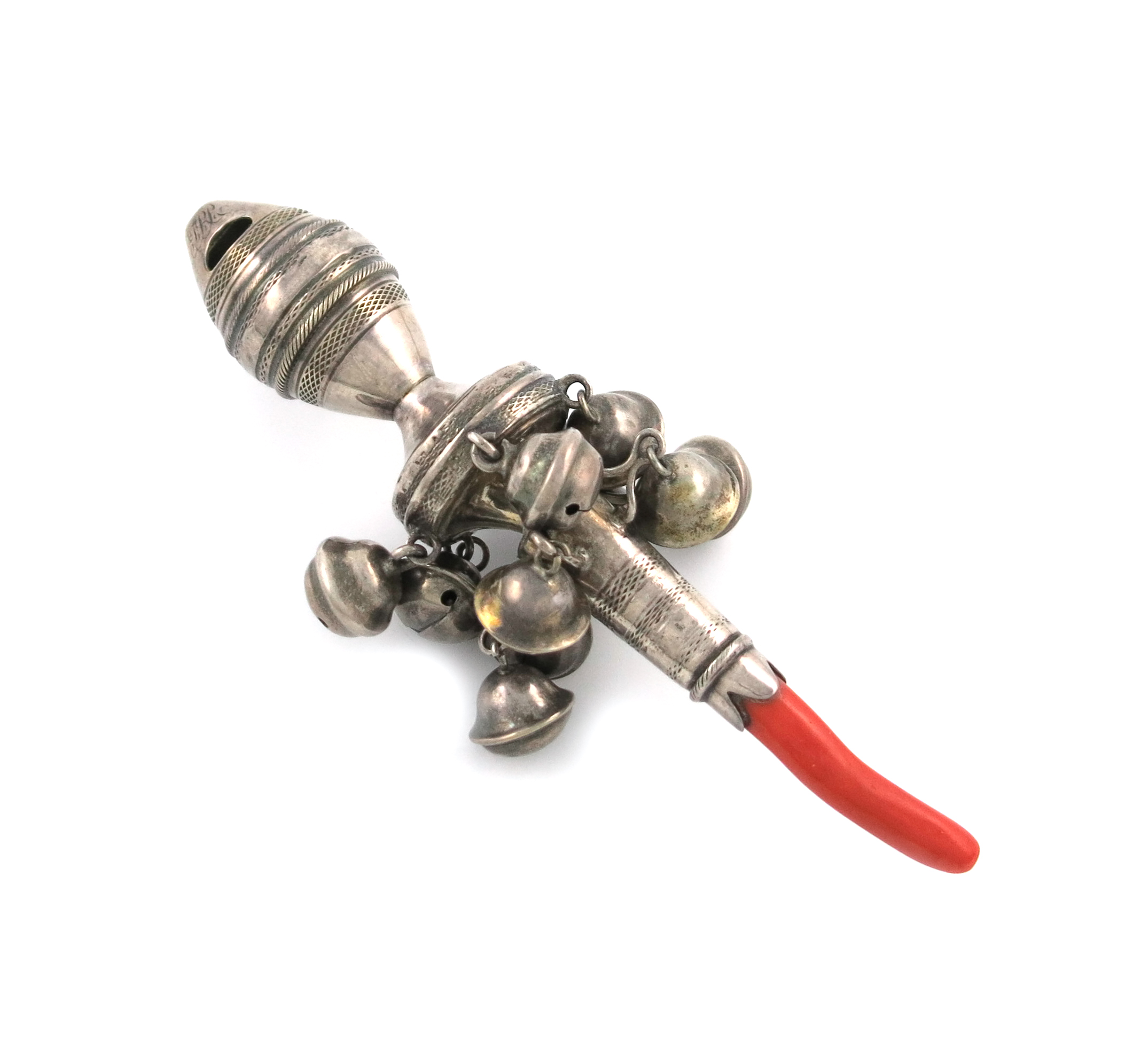 baluster form, engraved decoration, with a hinged loop attachment, ten bells and a coral teether, length 14.2cm.