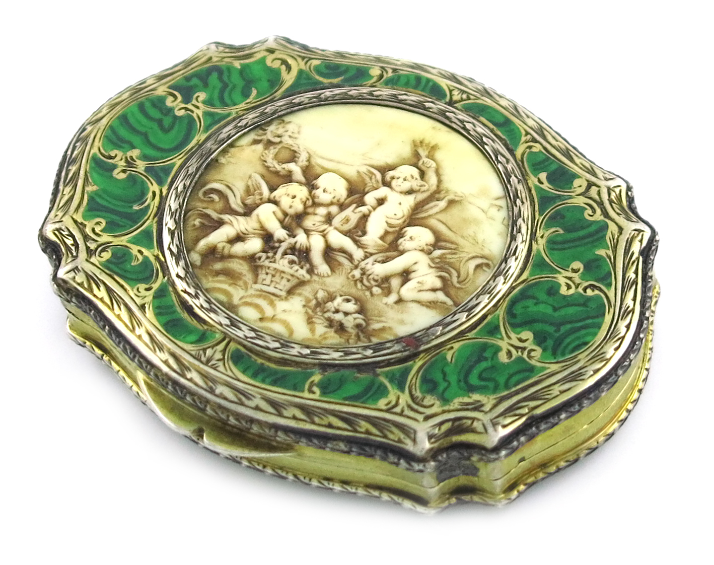 shaped oval form, the cover with a composite panel of cherubs with a green border, the interior with a mirror and hinged cover, engraved decoration, length 6.8cm.