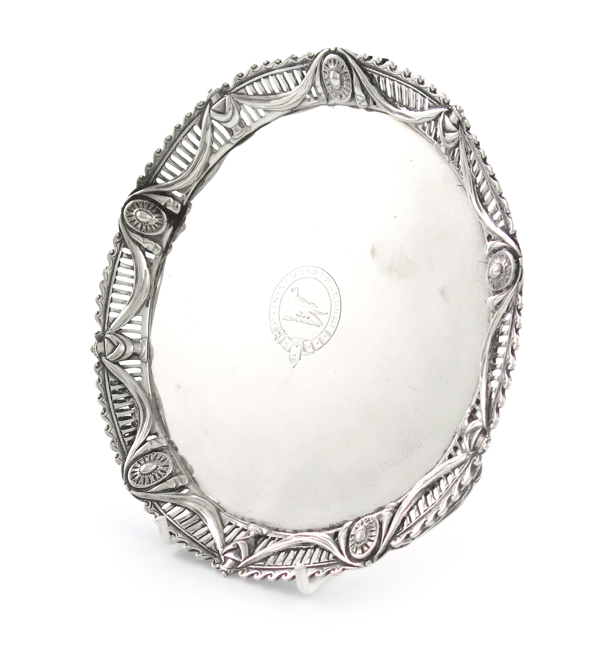 circular form, the border pierced with slats and embossed with medallions and drapes, on three pierced bracket feet, engraved with a crest, diameter 17cm, approx. weight 10oz.