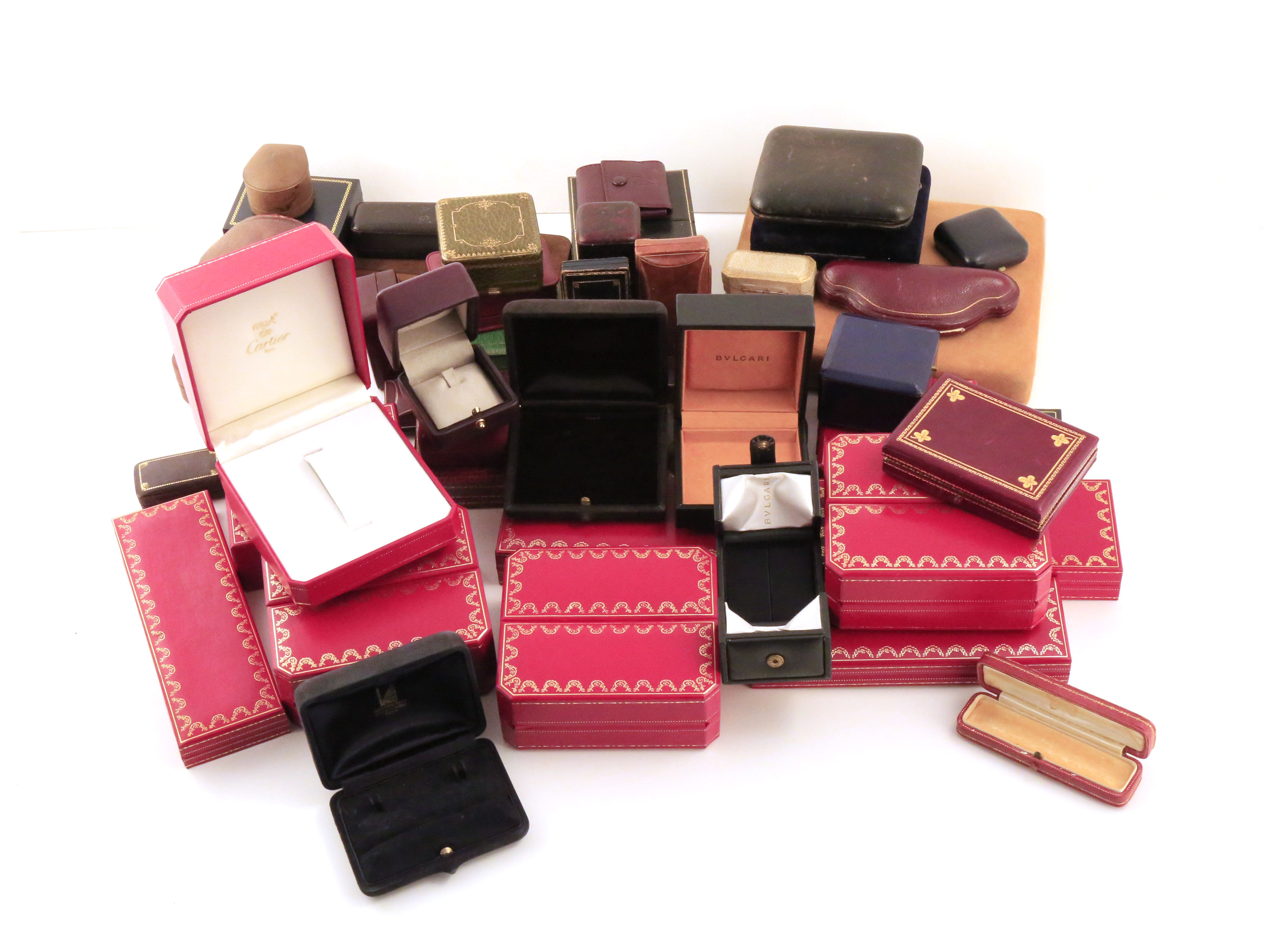 A collection of antique and modern jewellery boxes, including various boxes by Must de Cartier and others by BULGARI, Van Cleef & Arpels, Harry Winston, Asprey, etc.