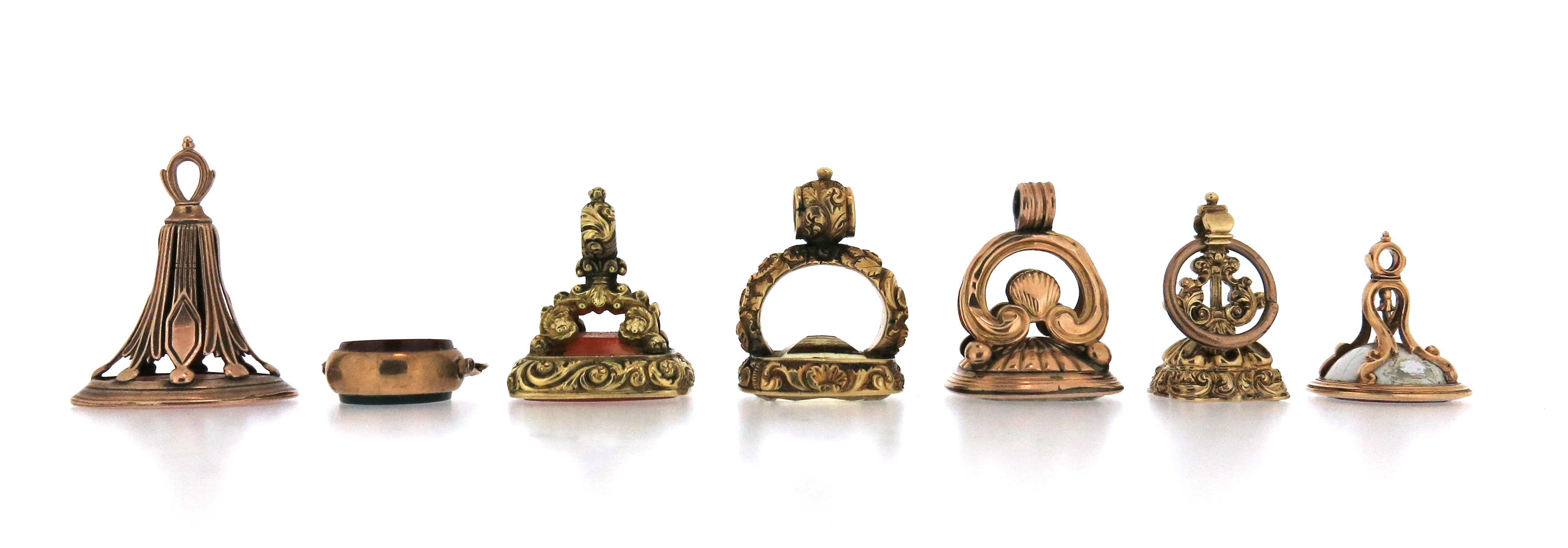 Six fob seals, including three engraved with full arms to the hardstone matrices, two with plain matrices and a spinning two-sided fob, and a fob seal mounted with a hardstone matrix carved with a figure of the Reverend George Whitefield who died in 1770