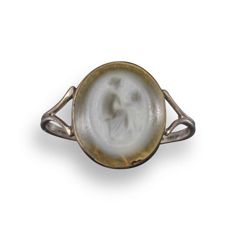 A carved agate oval-shaped intaglio-mounted gold ring, depicting a seated female figure, size K 1/2