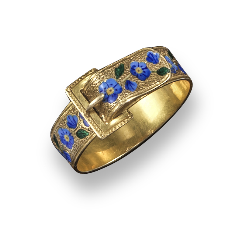 A 19th century gold buckle ring, decorated with blue enamel forget-me-nots, size O 1/2