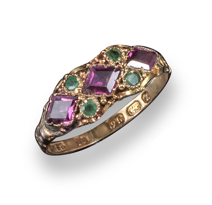 A 19th century amethyst and emerald ring, set in 15ct yellow gold scroll setting, Birmingham hallmarks for 1848, size P, case