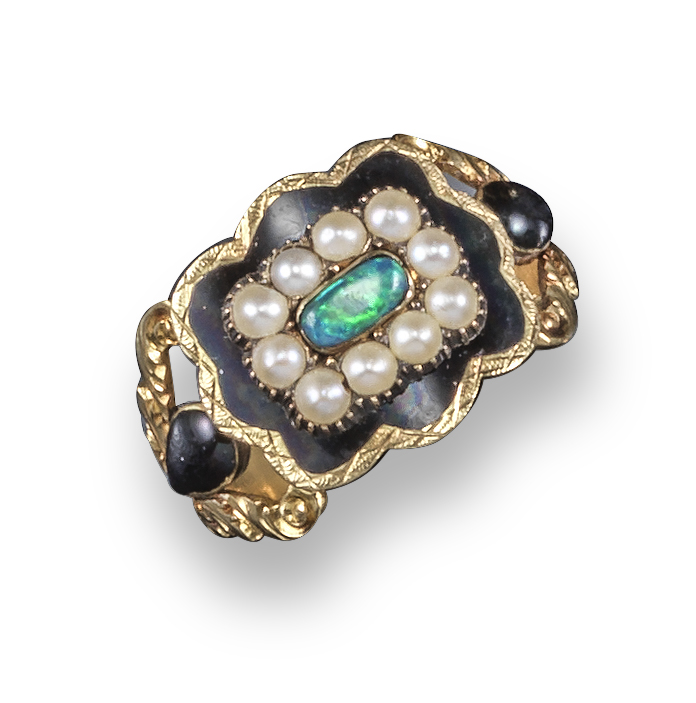 A 19th century opal and black enamel mourning ring