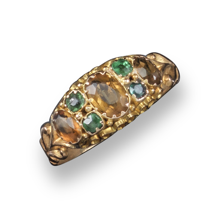 A 19th century citrine and emerald half-hoop ring, set in yellow gold scroll mount, size Q