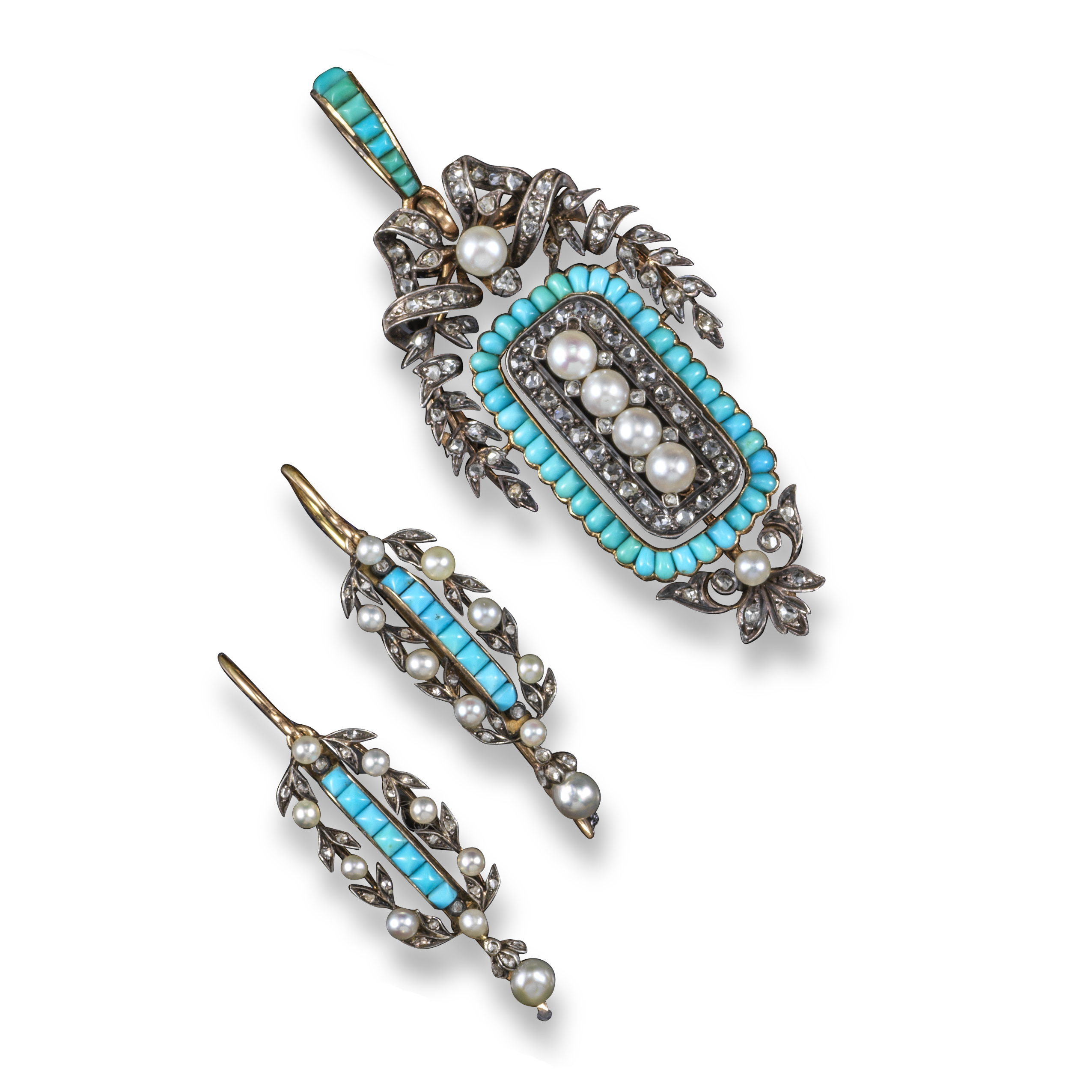 A Victorian turquoise diamond and pearl pendant and earrings, set with a central line of four pearls within a border of rose-cut diamonds and buff-top turquoise below a diamond-set bow and turquoise bale, with a similar pair of earrings in silver and gold, pendant 7cm high, earrings 4.5cm high