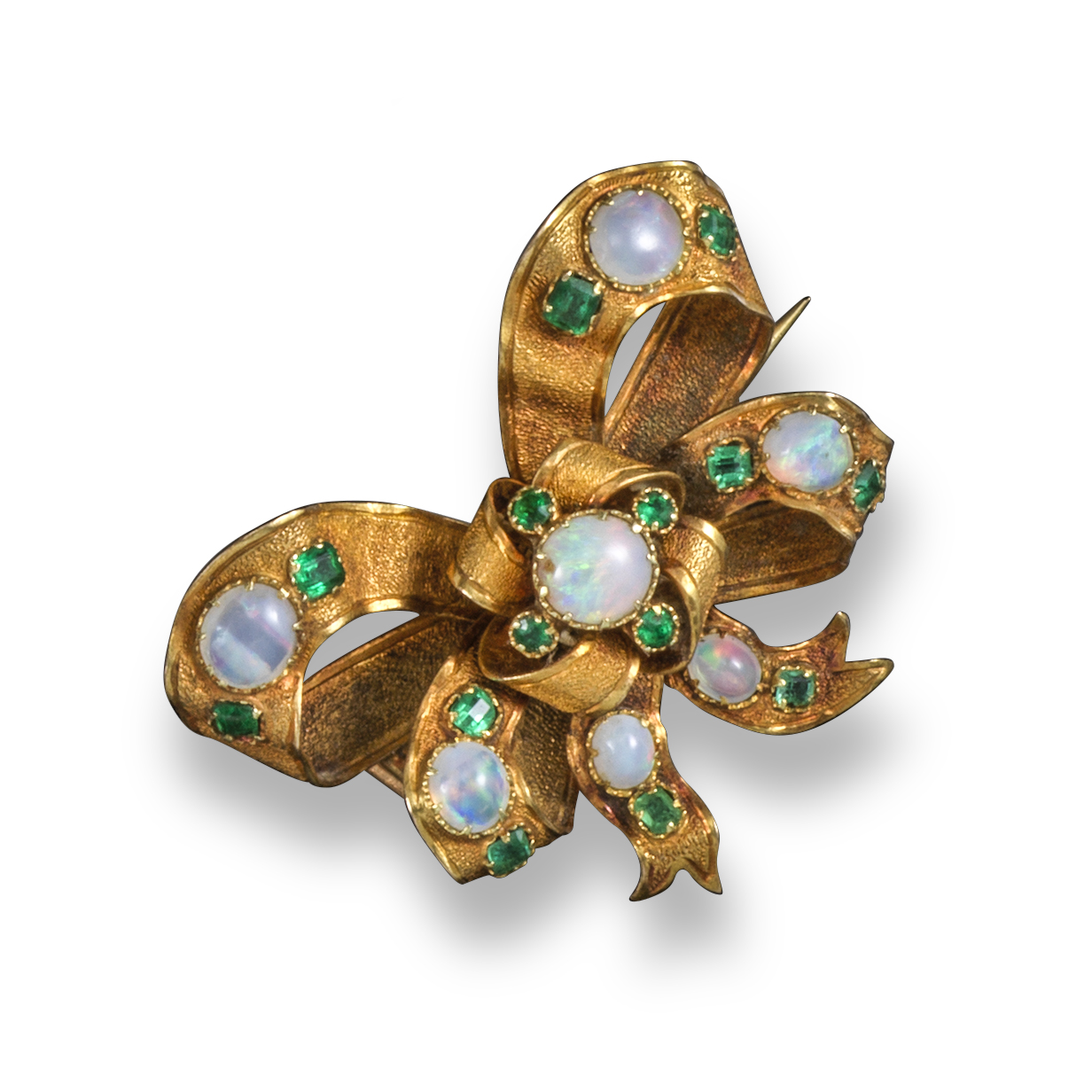 A mid 19th century opal and emerald bow brooch, set in yellow gold, 3.8cm wide