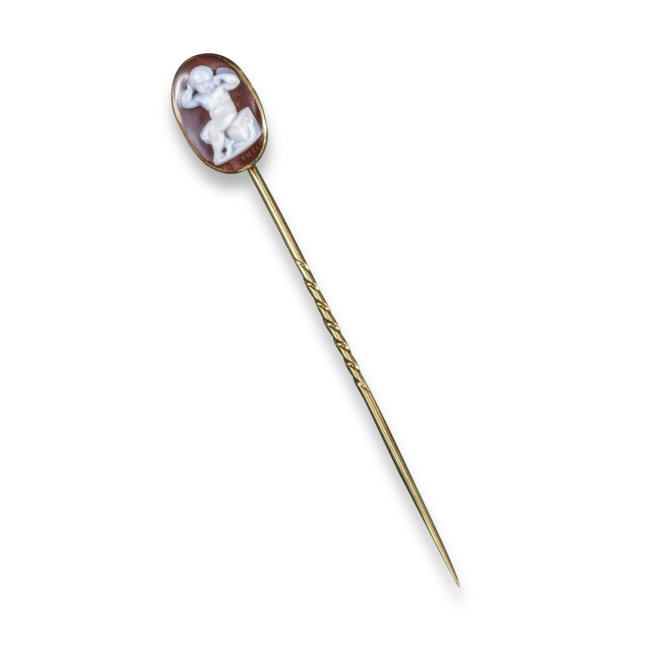 A late 19th century carved hardstone cameo, depicting a seated Cupid chained to a rock, his head held in his hands with despair, signed below Pistrucci, mounted in a gold stick pin
