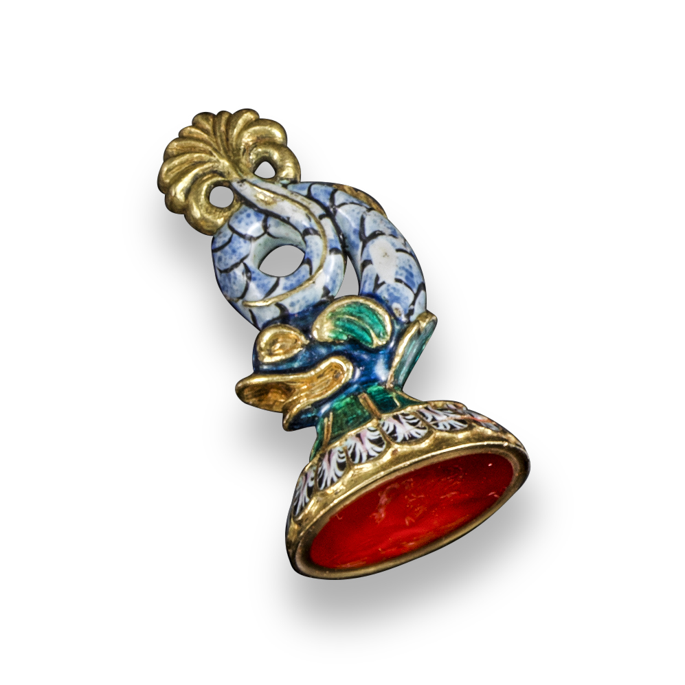 A small fob seal, c1800, the mount designed as a dolphin with polychrome enamel decoration and further decoration to the mount, the 18th century oval carved carnelian intaglio depicting Leander swimming to Hero at Hellespont, 2.7cm high