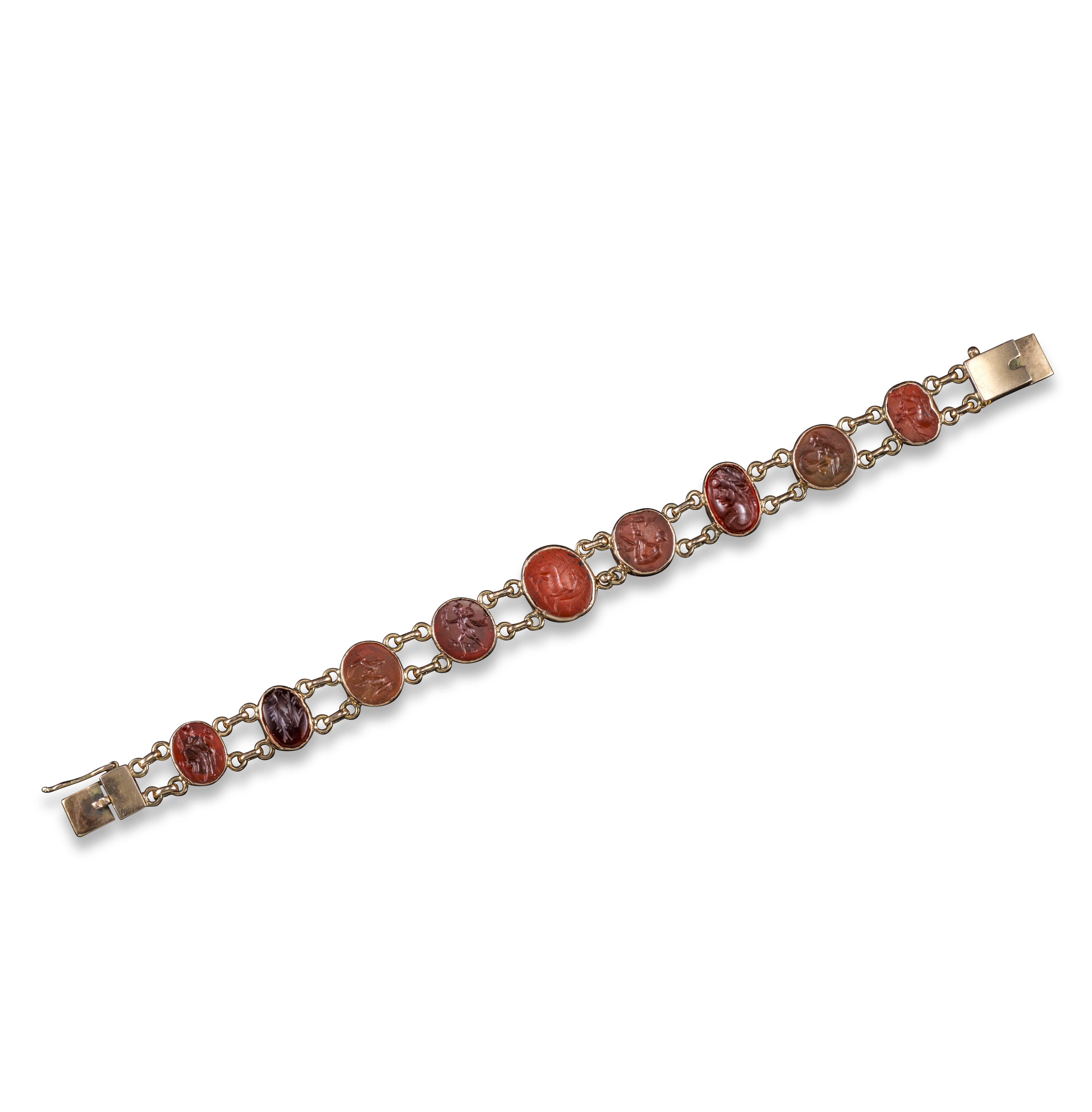 A gold bracelet (c1950) mounted with nine assorted carved carnelian oval intaglios, the majority probably Roman, 18.5cm