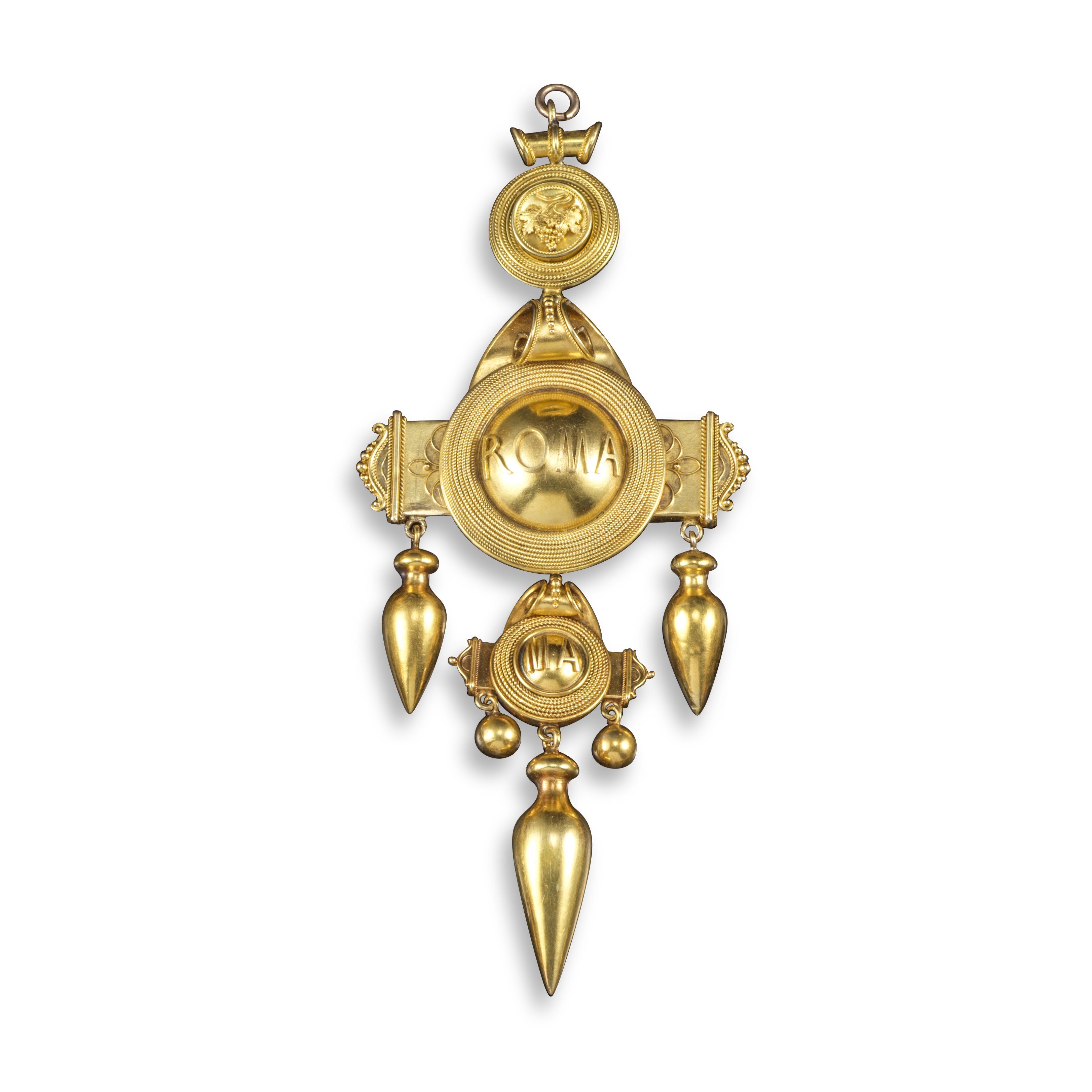 An Etruscan Revival gold pendant, the central hemisphere set with the intials ROMA within ropetwist and pellet decoration, suspending amphora and initials MA under fruiting vines in yellow gold, 11cm long, fitted case