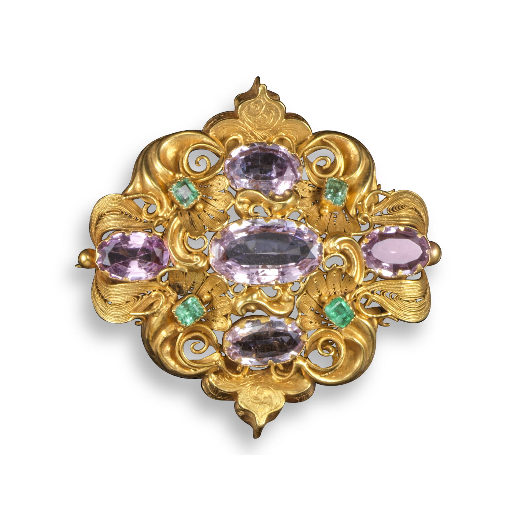 A Regency pink topaz and emerald gold brooch, set with graduated oval-shaped topaz and emeralds, with cannetille decoration, 4.6cm wide, fitted case