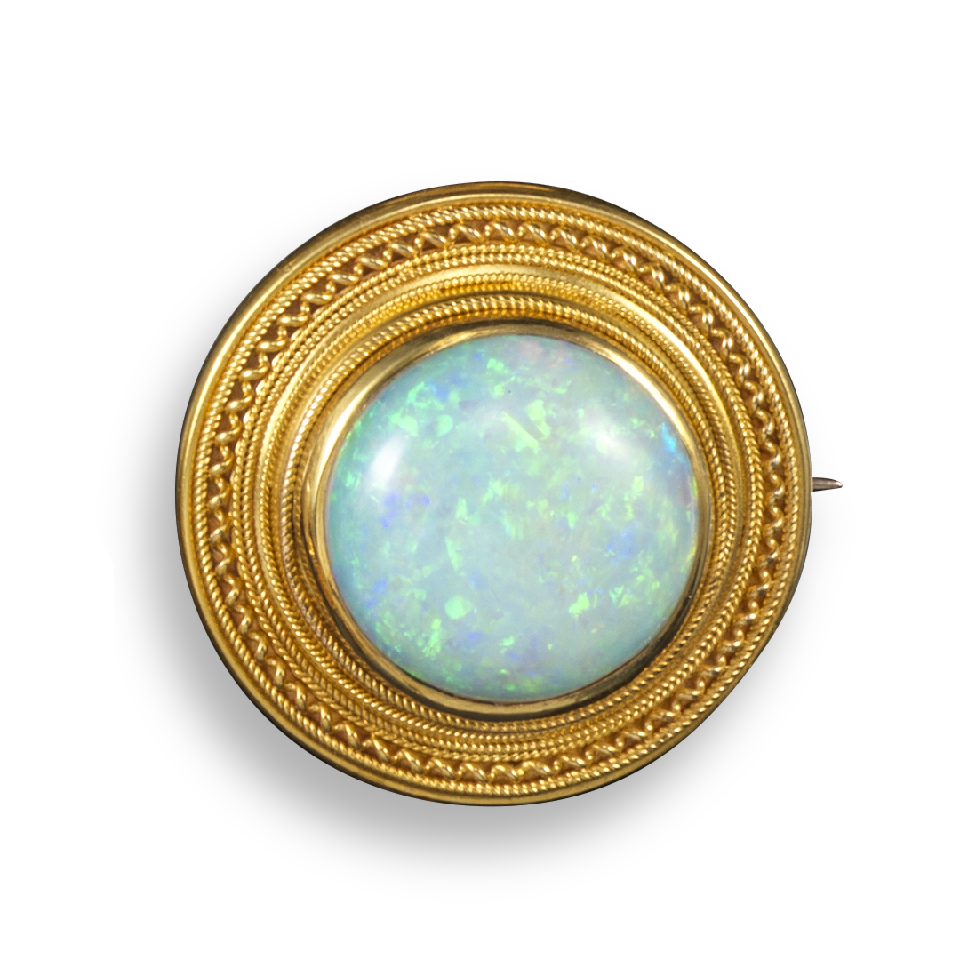 A Victorian Etruscan Revival gold brooch, set with a round solid white opal cabochon within ropetwist yellow gold border, 2.7cm wide, fitted case