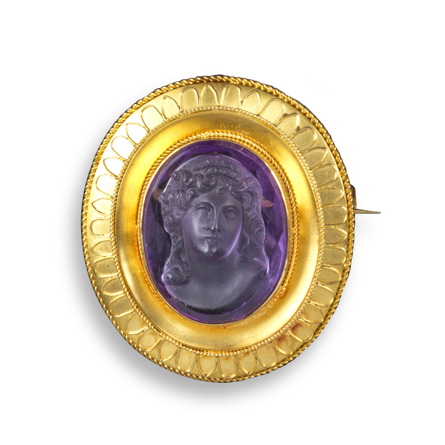 A carved amethyst cameo brooch, depicting a woman in profile within yellow gold ropetwist border, 4cm high