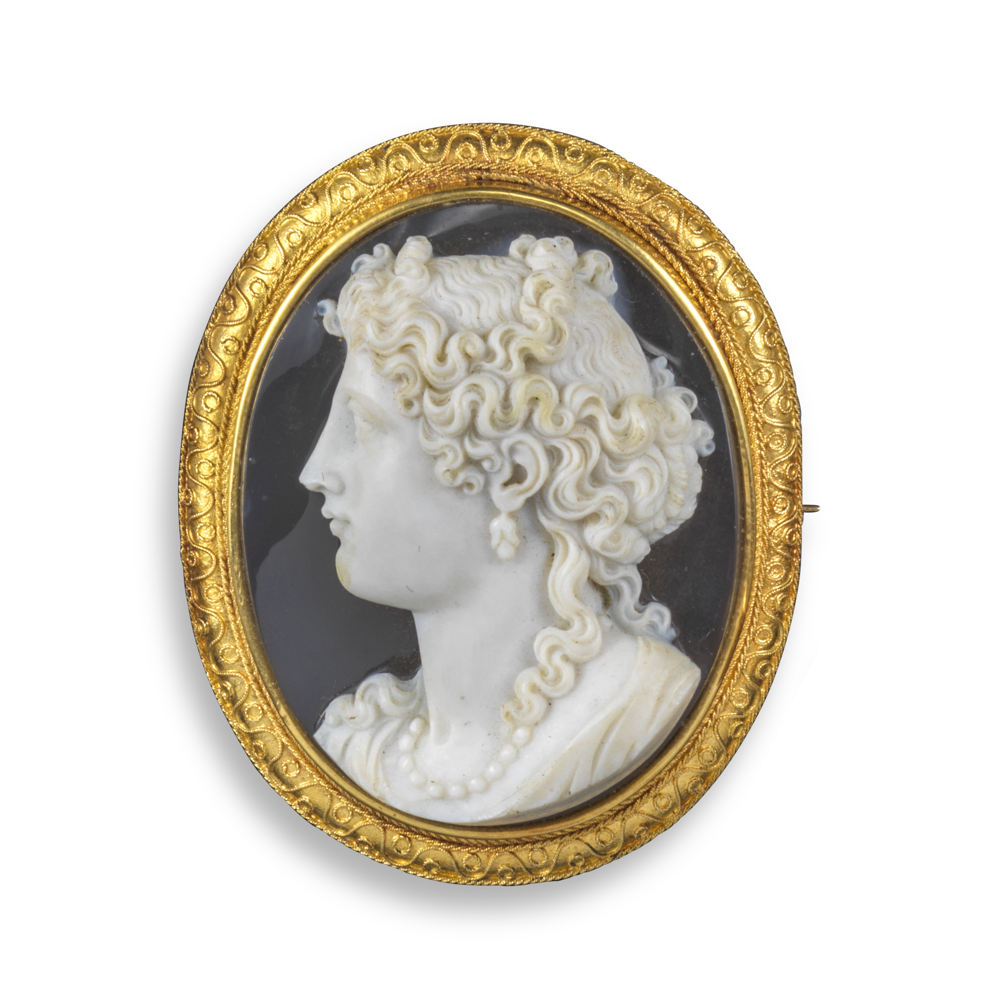 A Victorian hardstone cameo brooch, depicting a woman in profile with gold ropetwist border, 4.6cm wide