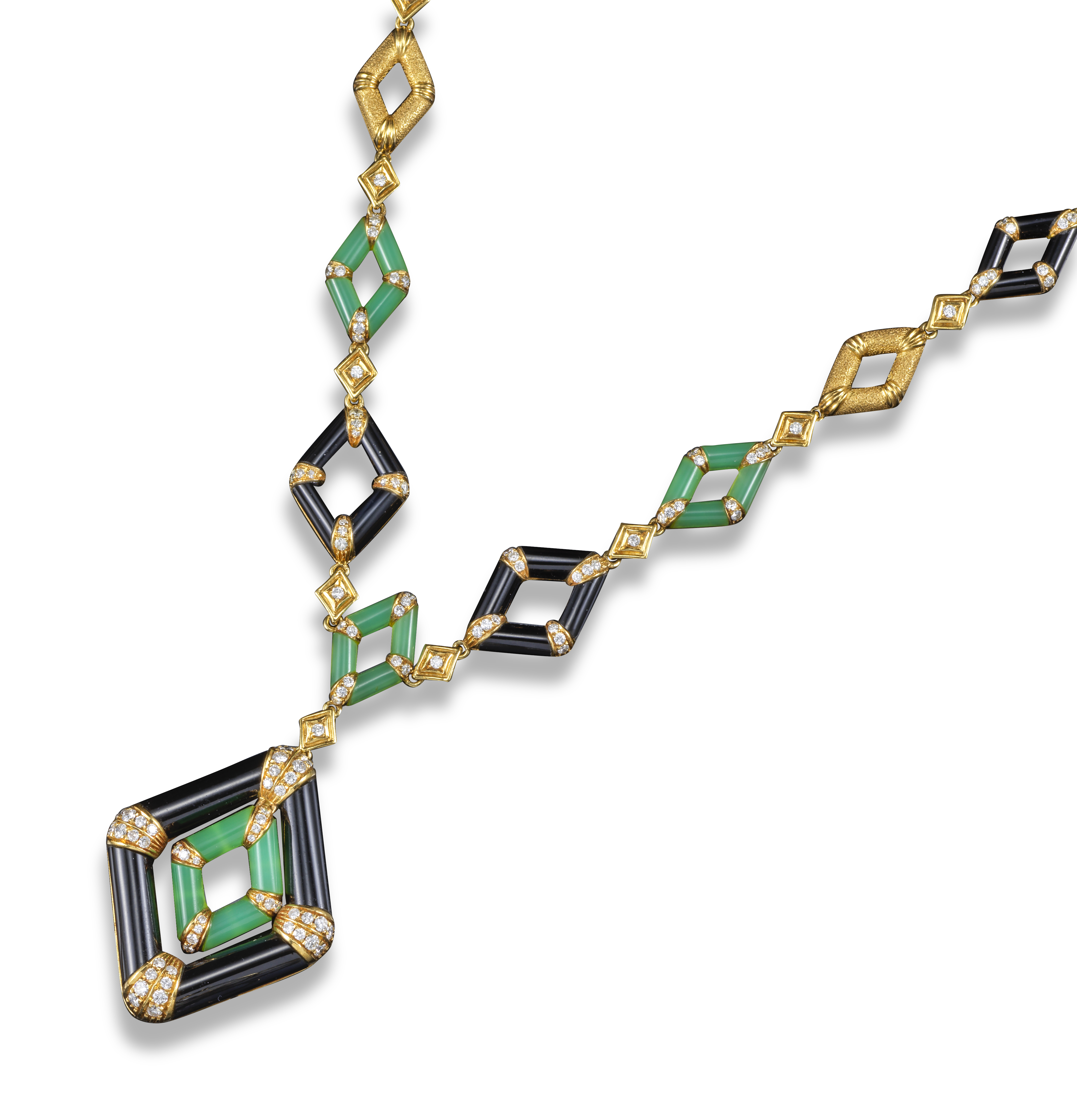 A chalcedony, onyx and diamond necklace, the pendant formed from an articulated chalcedony lozenge within an onyx lozenge, quartered with diamonds, suspending from a conforming necklace, 48cm long