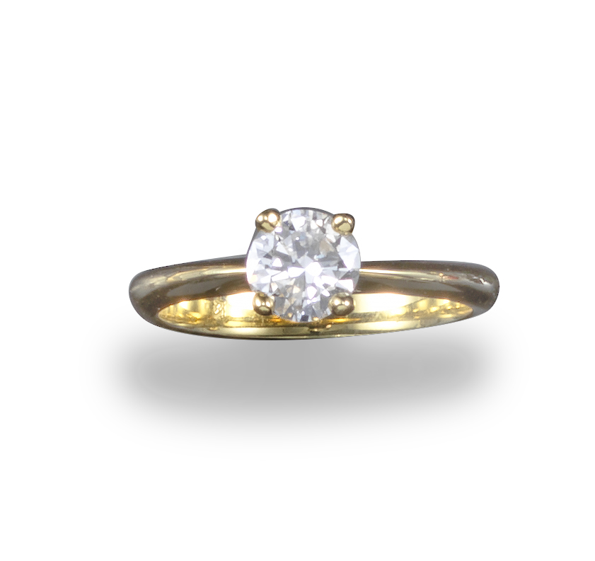 A diamond solitaire ring, the round brilliant-cut diamond weighs approximately 0.75cts, set in yellow gold, size M