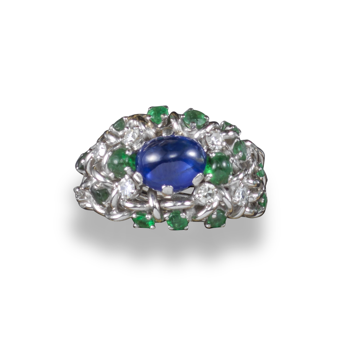 A sapphire, emerald and diamond cluster ring, of openwork knotted design and set with an oval cabochon sapphire and two emerald cabochons, in a surround of graduated circular-cut emeralds and diamonds in white gold, size I