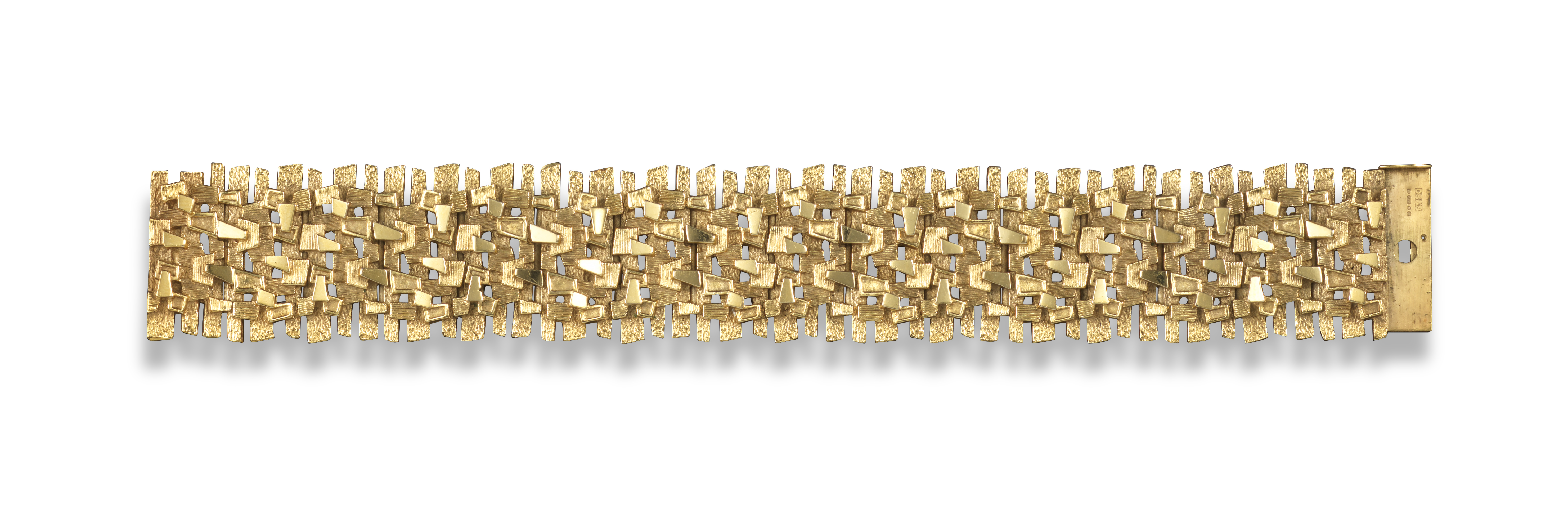 An abstract gold bracelet, with textured and plain decoration, London hallmarks for 9ct gold, 1975, maker DS&S, 17.5cm long, 57g