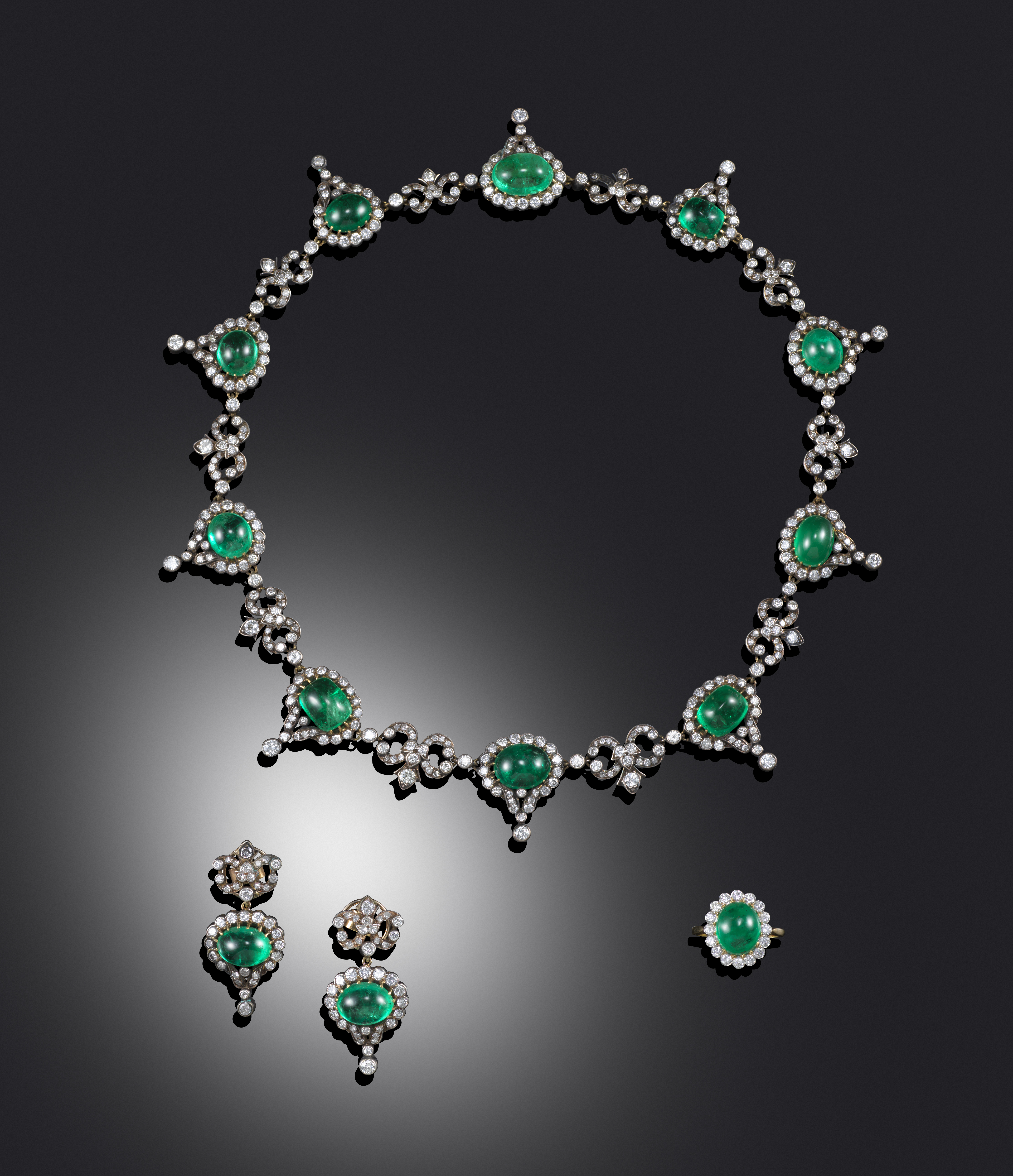 A cabochon emerald and diamond suite of jewellery, the necklace set with ten emeralds, each set within a cluster of circular-cut diamonds and joined with diamond-set bows in silver and gold, 42cm long, with a matching pair of earrings and a conforming ring set in yellow gold, size P, fitted case by Garrard