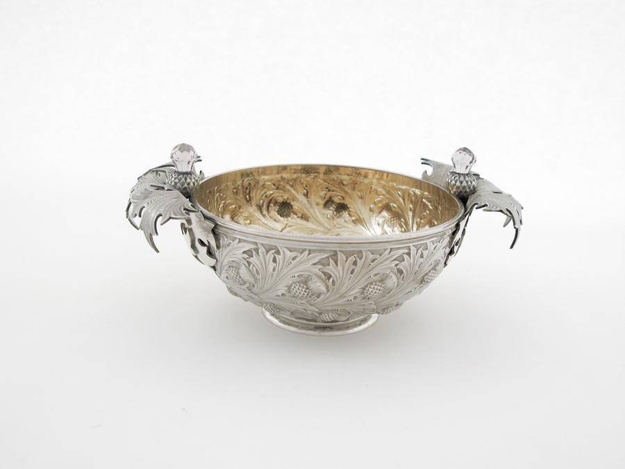 A modern Scottish quaich, embossed all over with thistles, handles formed as textured thistle leaves and set with faceted amethysts, gilt interior, by Hamilton & Inches, Edinburgh 1913, 8.25in (21cm) long, 15.9oz.