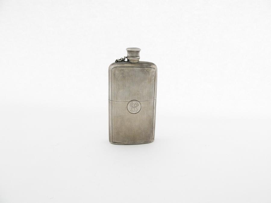A Victorian, engine-turned spirit flask, with a screw cover, secured by a chain and a pull-off base, monogrammed, by Thos. Johnson, London 1863, retailed by "Thornhill, 144 Bond St", 6in (15.3cm) high, 10oz.