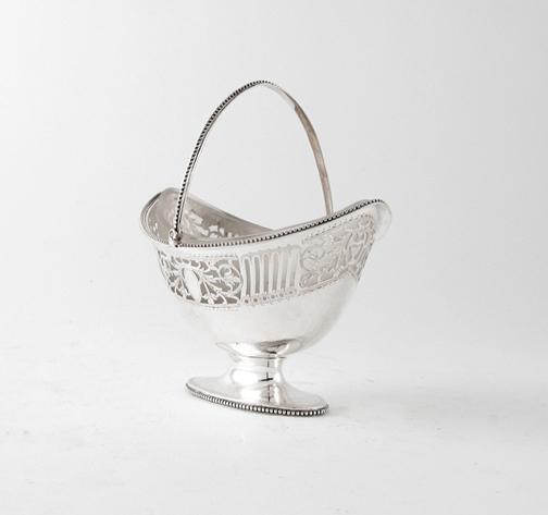 A George III swing handled sugar basket, of navette outline with pierced and engraved sides, and bead borders, (clear glass liner), by William Plummer, London 1784, 6.5in (16.5cm) wide, 6oz weighable silver.