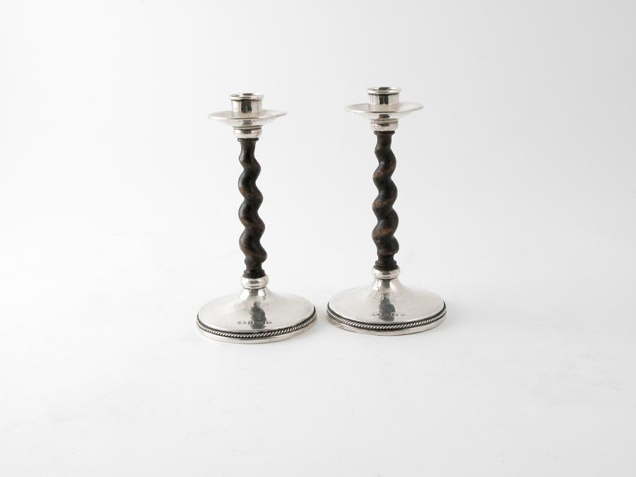 A pair of mounted oak, dwarf candlesticks, with barley twist columns and circular bases with a 'rope'border, by A.E. Jones, Birmingham 1920 (loaded), 6in (15cm) high. (2)