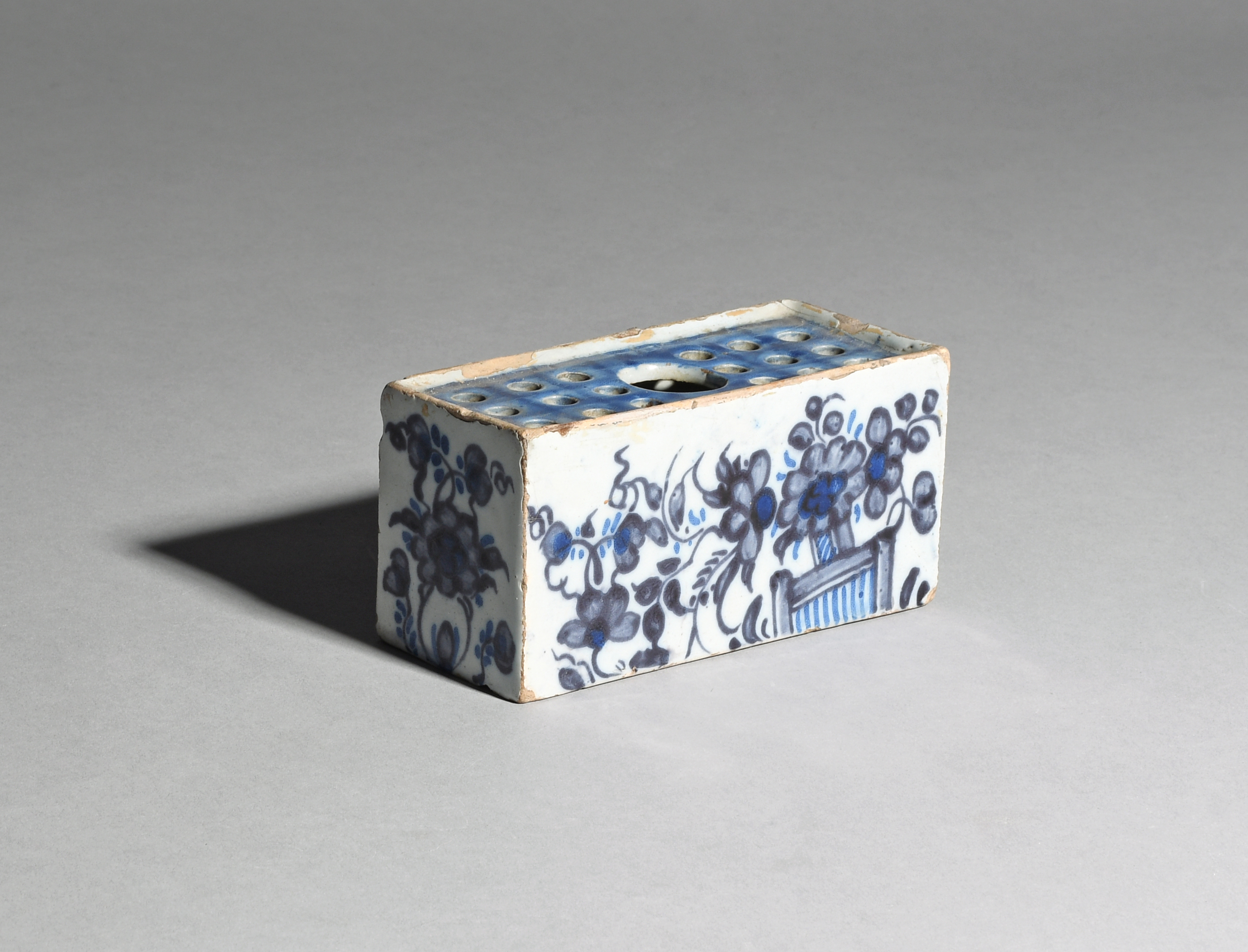A small delftware flower brick c.1760, the rectangular form painted in shades of blue with flowering branches issuing from a short fence, the recessed top pierced with nine small holes either side of a central circular opening, some restoration, 12.5cm across.