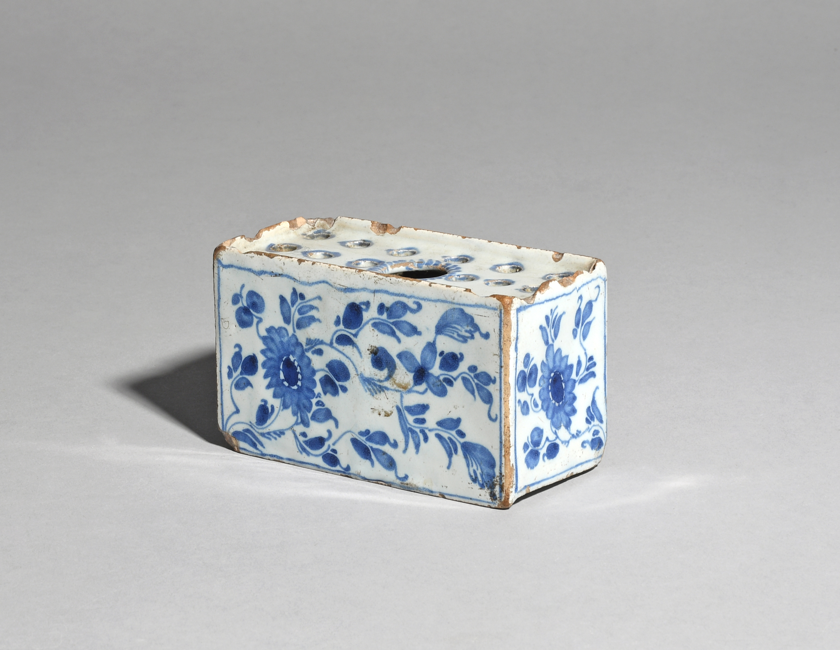 A small delftware flower brick c.1750, the rectangular form painted with flowering mimosa sprays to all four sides, the recessed top pierced with an arrangement of 18 small holes around a central circular aperture, some chipping, 11.5cm across.