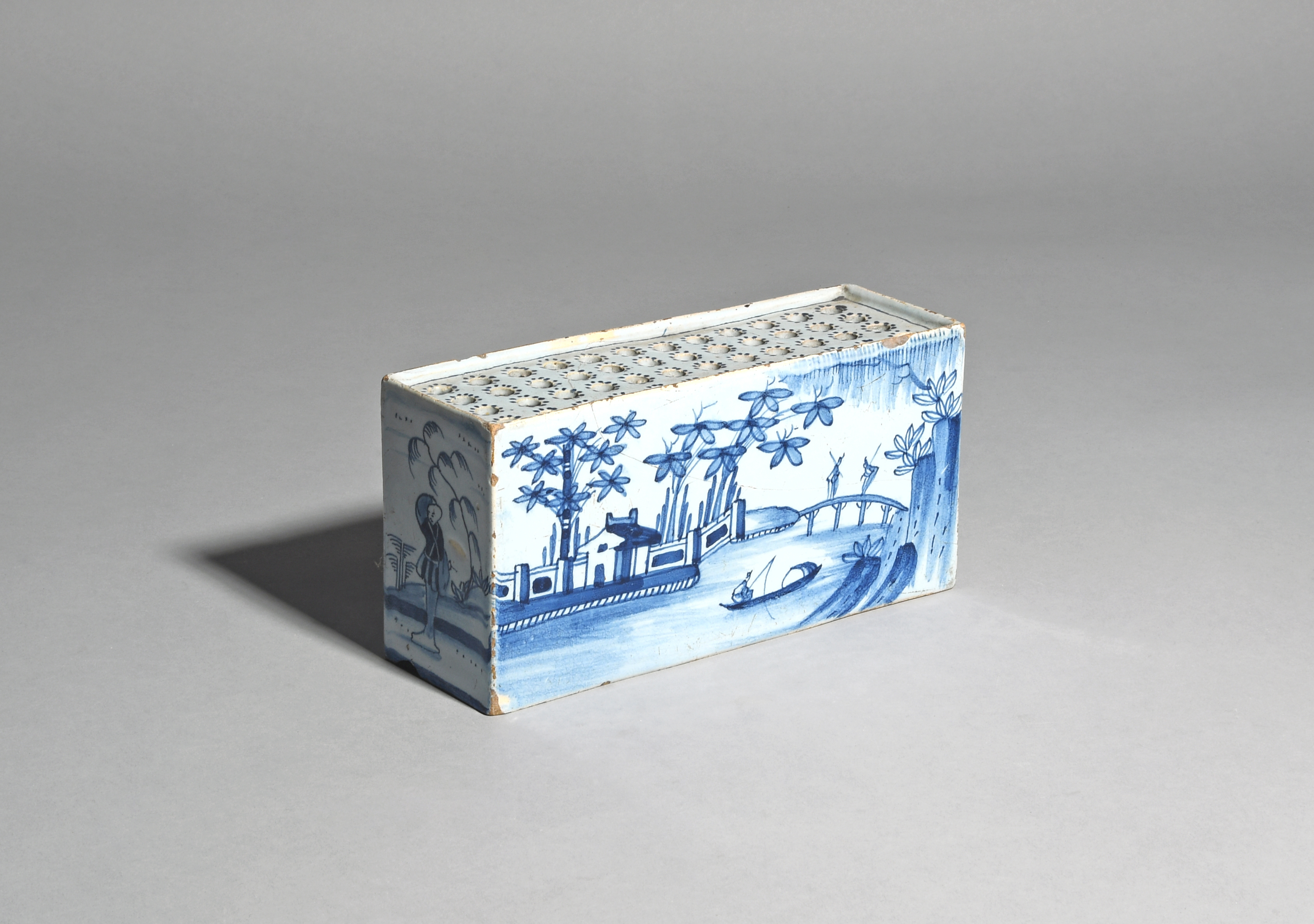 A delftware flower brick of exceptionally large size c.1760, probably Bristol, the rectangular form painted in blue with two figures meeting on a bridge, another fishing from a boat in a Chinese island landscape, the short sides each with a lone Chinese figure scratching his head, the top pierced with twelve rows of four small holes, a few small chips, 22.8cm.