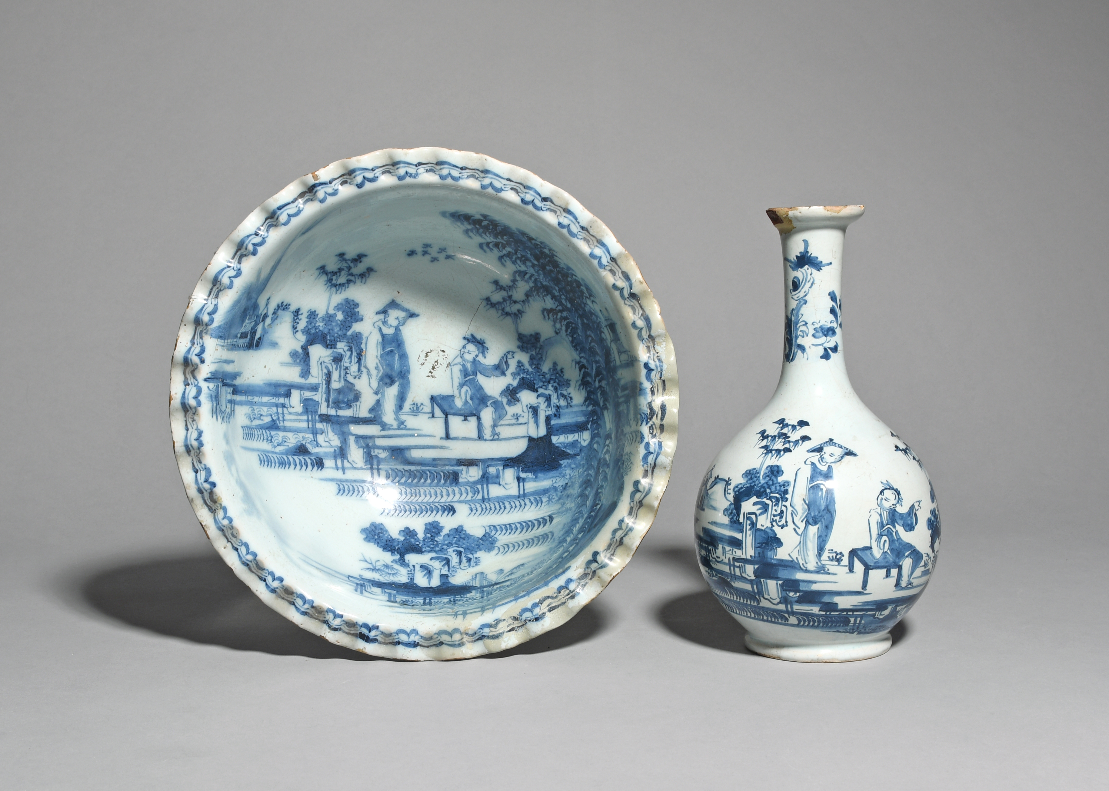 A delftware guglet and wash basin c.1750-70, the guglet or bottle form with long neck and everted rim, the bowl with a wavy everted rim, each painted in blue with two Chinese figures beside trees and rockwork in a garden setting, some damages and restoration, 26.7cm max. (2)