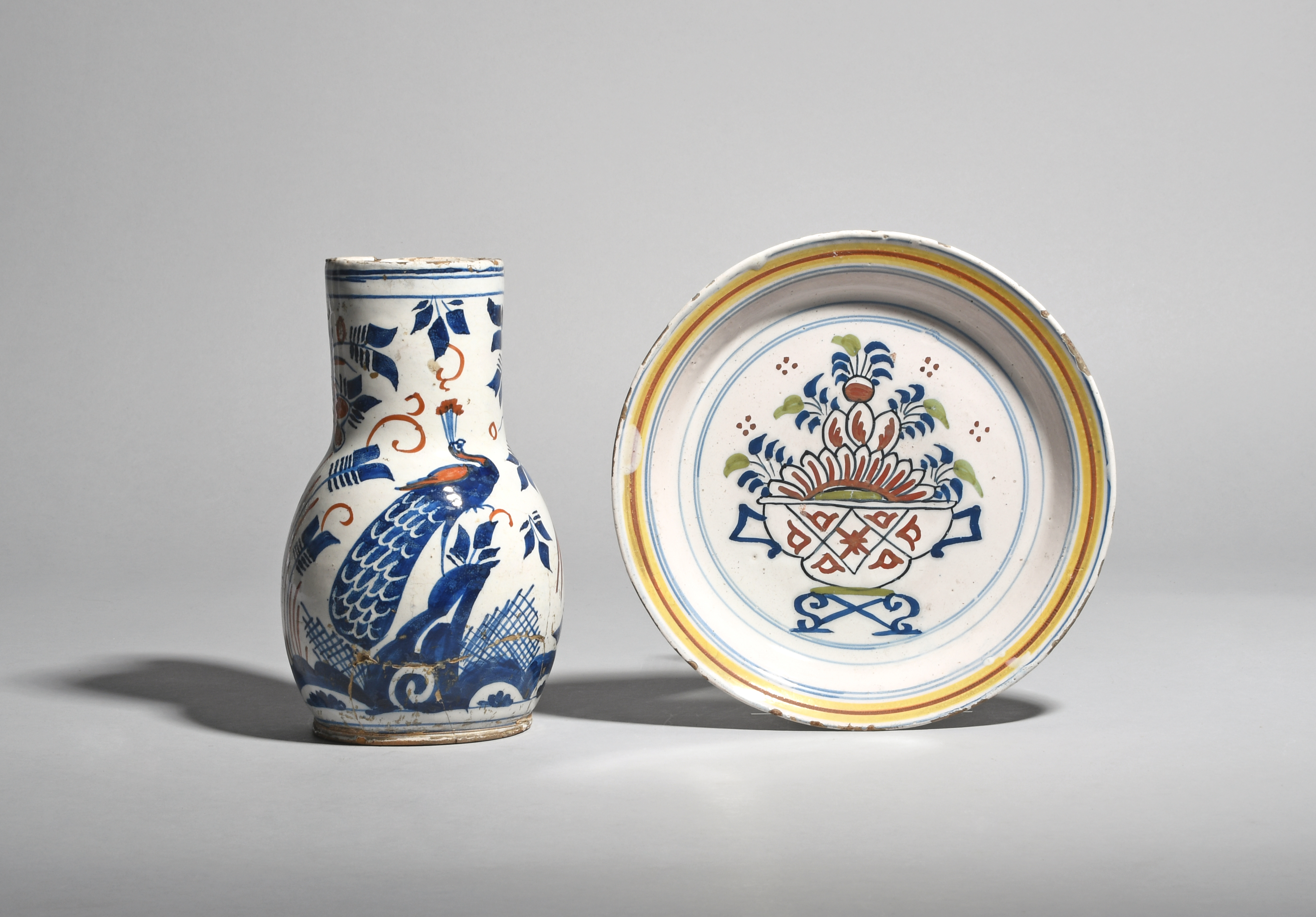 A Delft jug c.1700-20, decorated in red and blue with a peacock and other long-tailed birds amidst flowering plants, the loop handle with blue dash detailing, and a Delft plate painted in polychrome enamels with a vase of flowers within concentric circle bands in blue, yellow and red, the jug broken and restuck, 22cm max. (2)