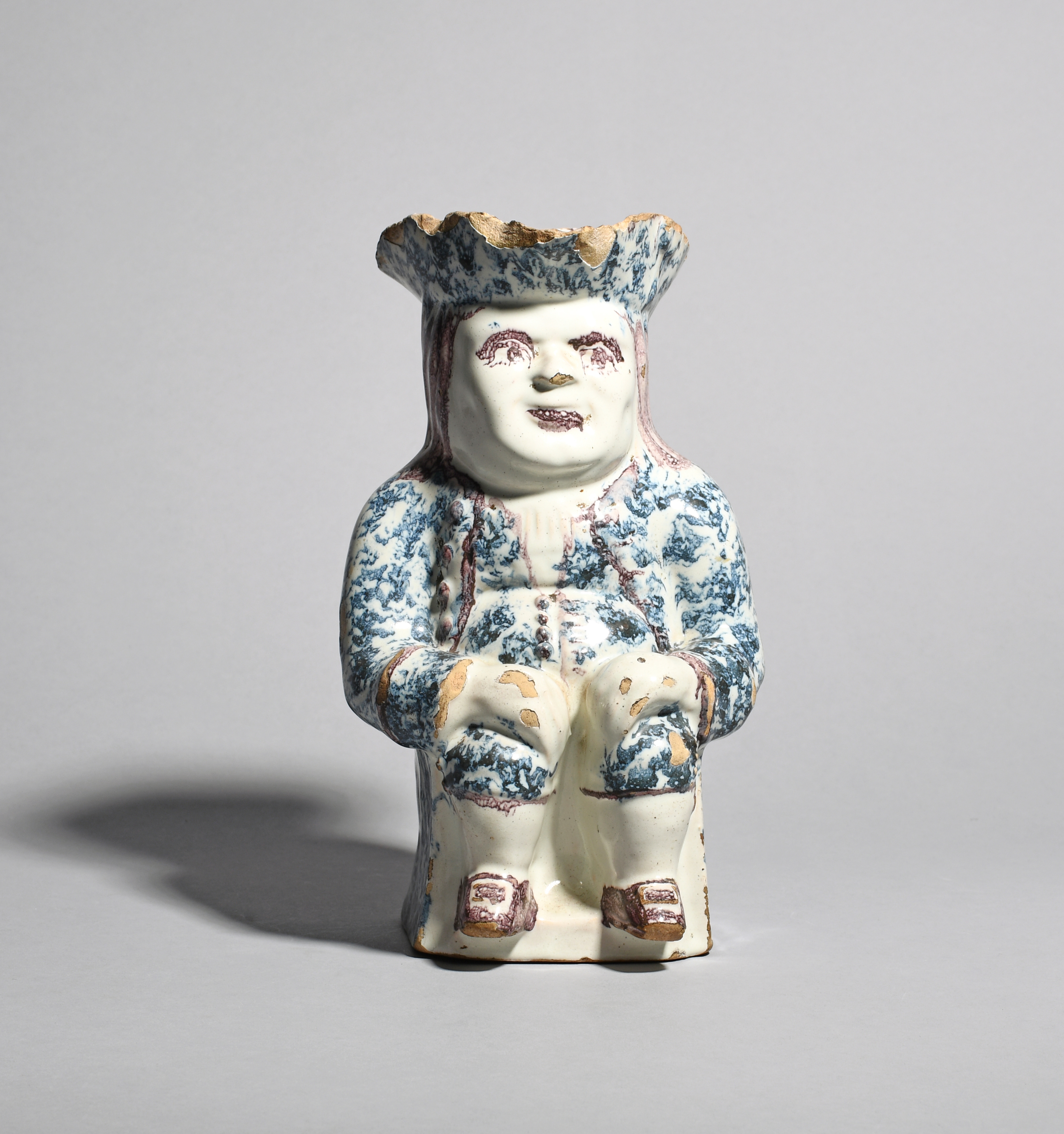 A Delft Toby jug c.1770, seated on a low box with his hands resting on his knees, wearing a sponged blue suit with manganese detailing, some chipping, 24.5cm.